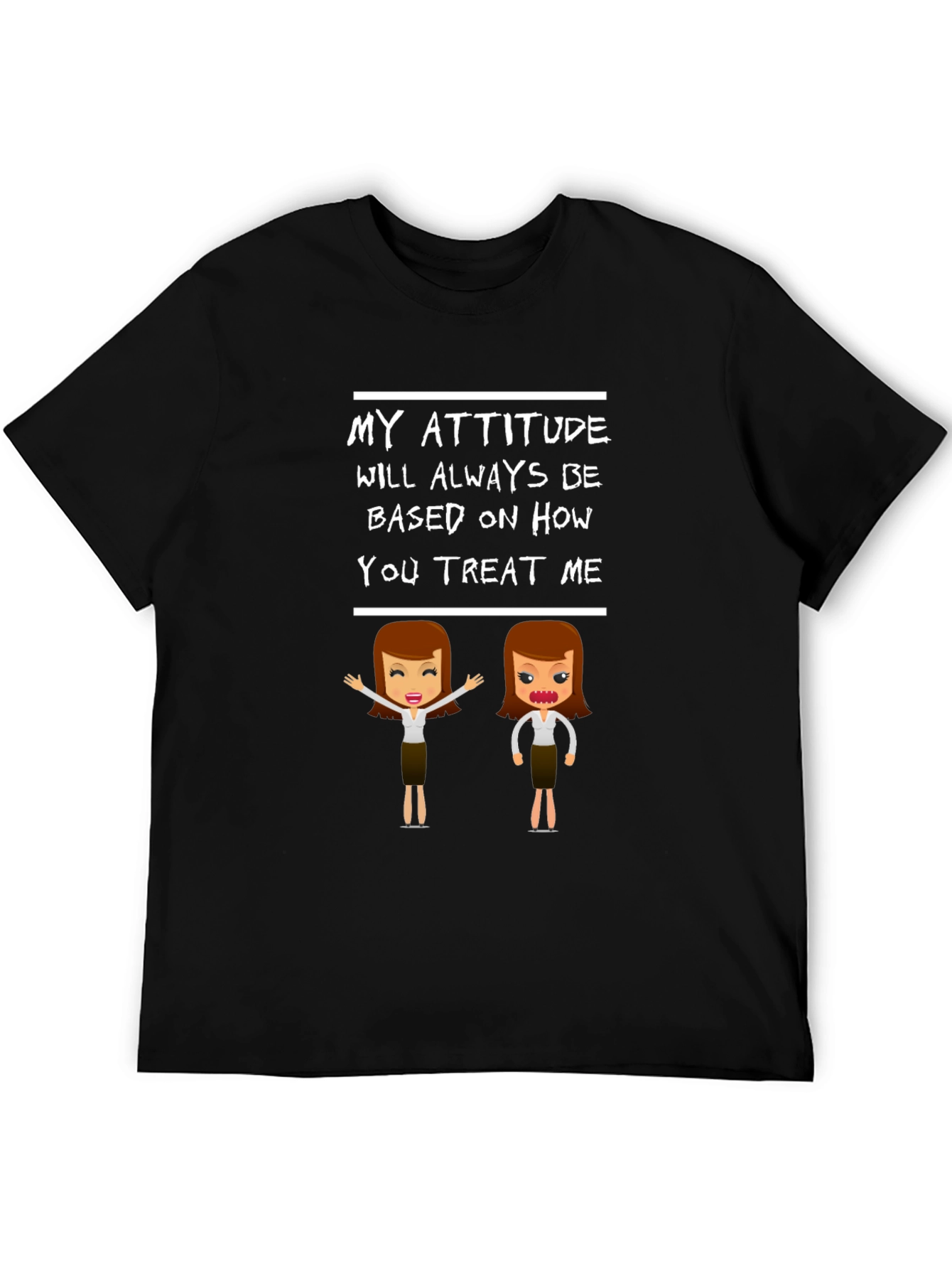Express your personality with this humorous black graphic tee! The shirt features the statement "My attitude will always be based on how you treat me" with two cartoon characters displaying different reactions. It appears to be made from soft, breathable fabric, ideal for everyday wear. This eye-catching T-shirt is great for casual outings, social gatherings, or simply lounging at home. A great conversation starter with a touch of fun, guaranteed to make a statement and show off your unique personality. Get yours today!