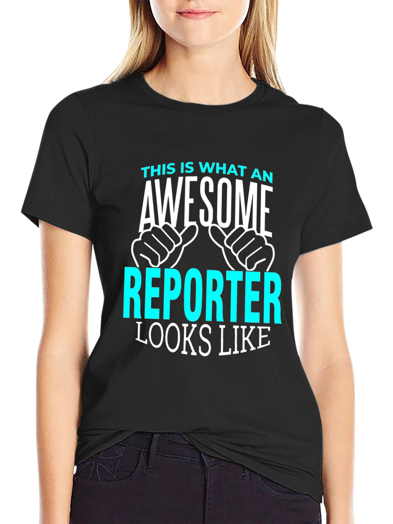 Show off your pride and humor with this black t-shirt featuring a bold graphic design. The statement "This is what an AWESOME REPORTER looks like" is prominently displayed in white and cyan, with two thumbs-up symbols adding a touch of fun. Made from a comfortable fabric, this tee is perfect for casual wear, work events, or as a gift for the awesome reporter in your life. Wear it to the office, journalism conferences, or on the go to show your passion for reporting. A great way to express your profession with a touch of lightheartedness.