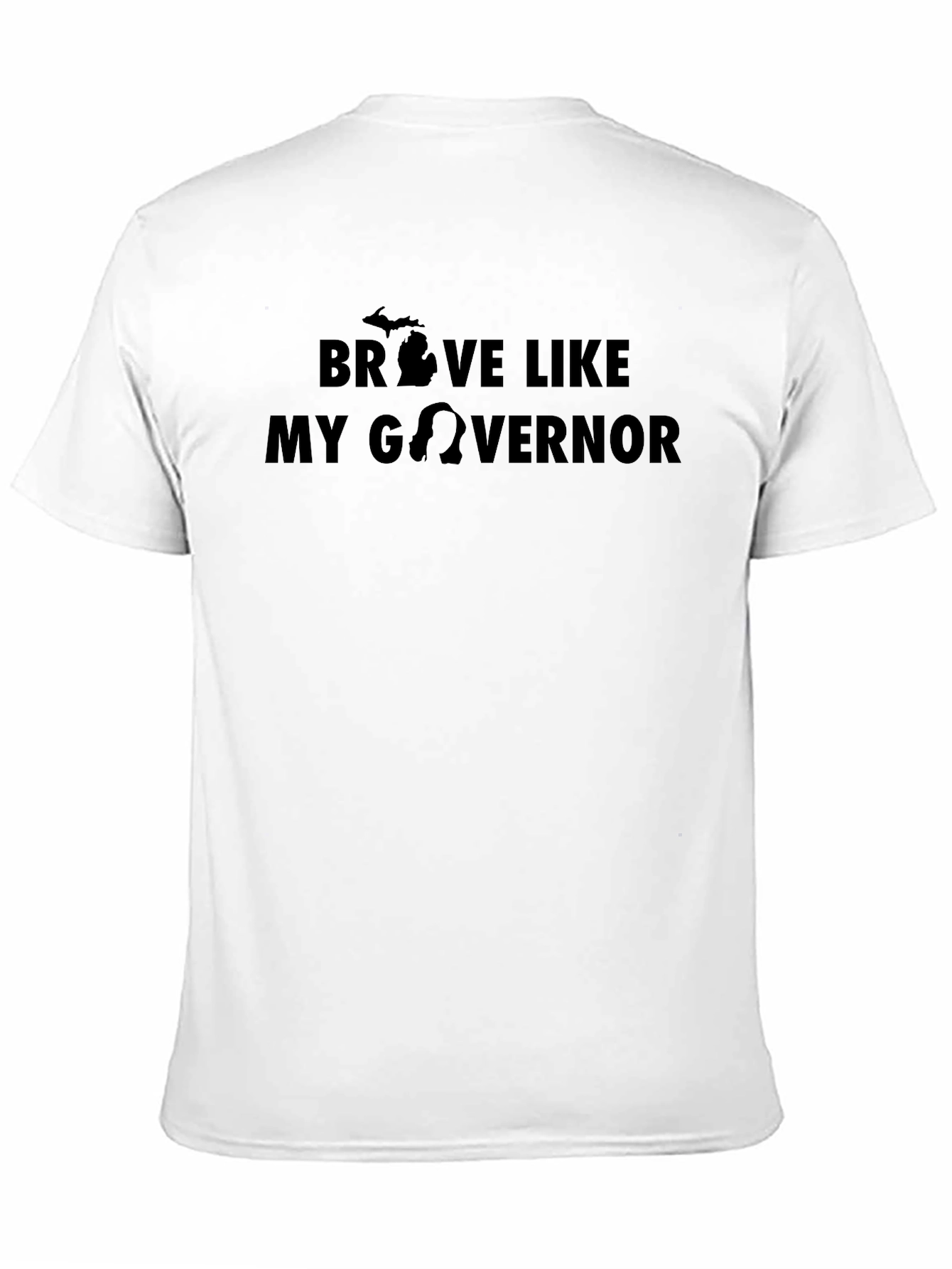 Show your support with this "Brave Like My Governor" T-shirt. This classic tee features bold black lettering making a statement, with the silhouette of the state of Michigan. Made from a soft, comfortable fabric, this shirt is perfect for everyday wear. The design is printed on a dark-colored shirt for a stylish and impactful look. Wear it to rallies, community events, or simply as a proud expression of your values. Comfortable and eye-catching, this T-shirt is a must-have for anyone wanting to make a statement.
