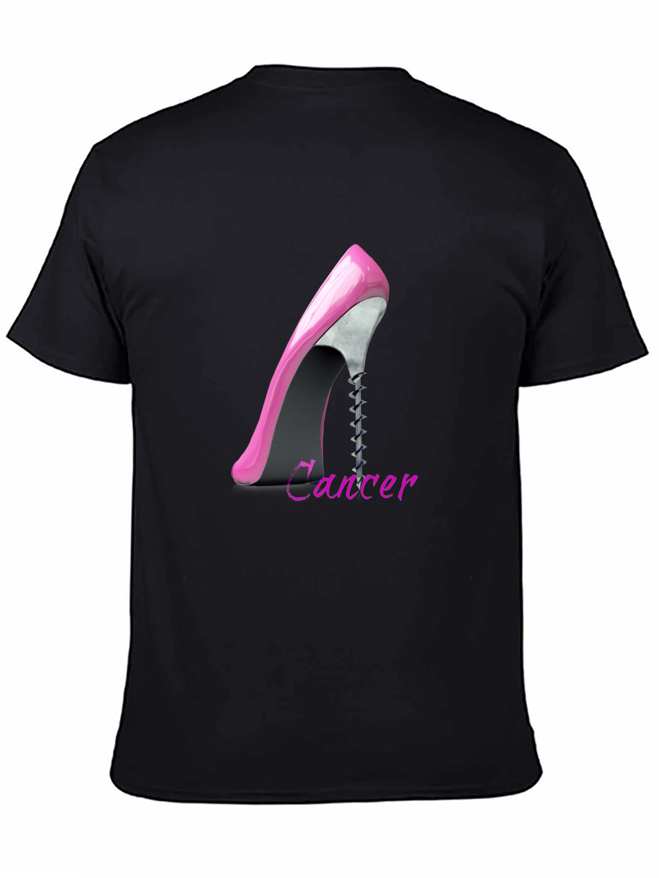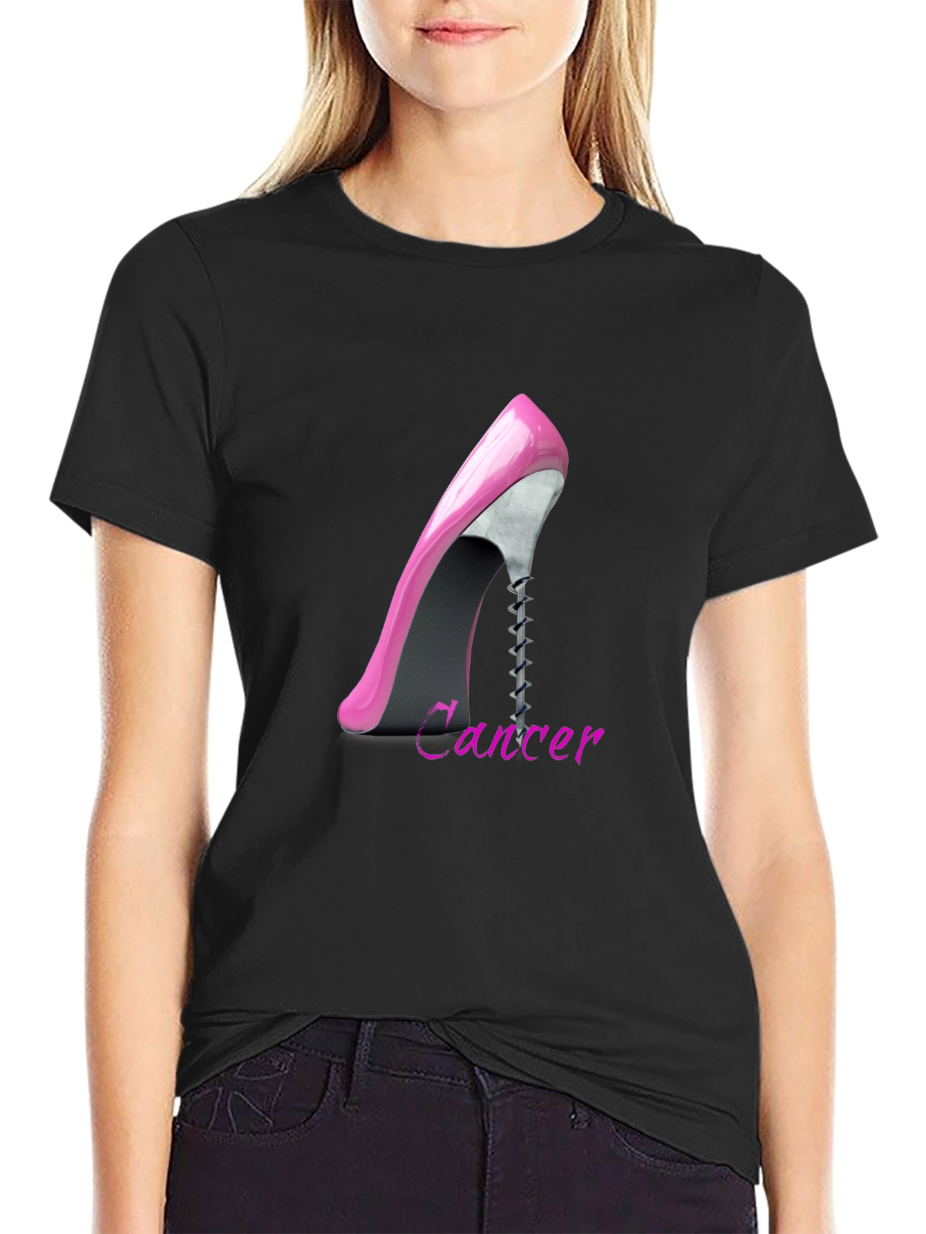 Show off your zodiac sign with this unique t-shirt. Featuring a vibrant, digitally rendered graphic of a high heel shoe with an innovative design, it playfully incorporates the Cancer zodiac symbol with the word "Cancer". The design has a sleek, modern look and would appeal to those with an interest in astrology or fashion. The shirt's dark color makes the colorful graphic stand out and would make a great conversation starter. This t-shirt is comfortable enough for everyday wear and a fun way to express yourself.