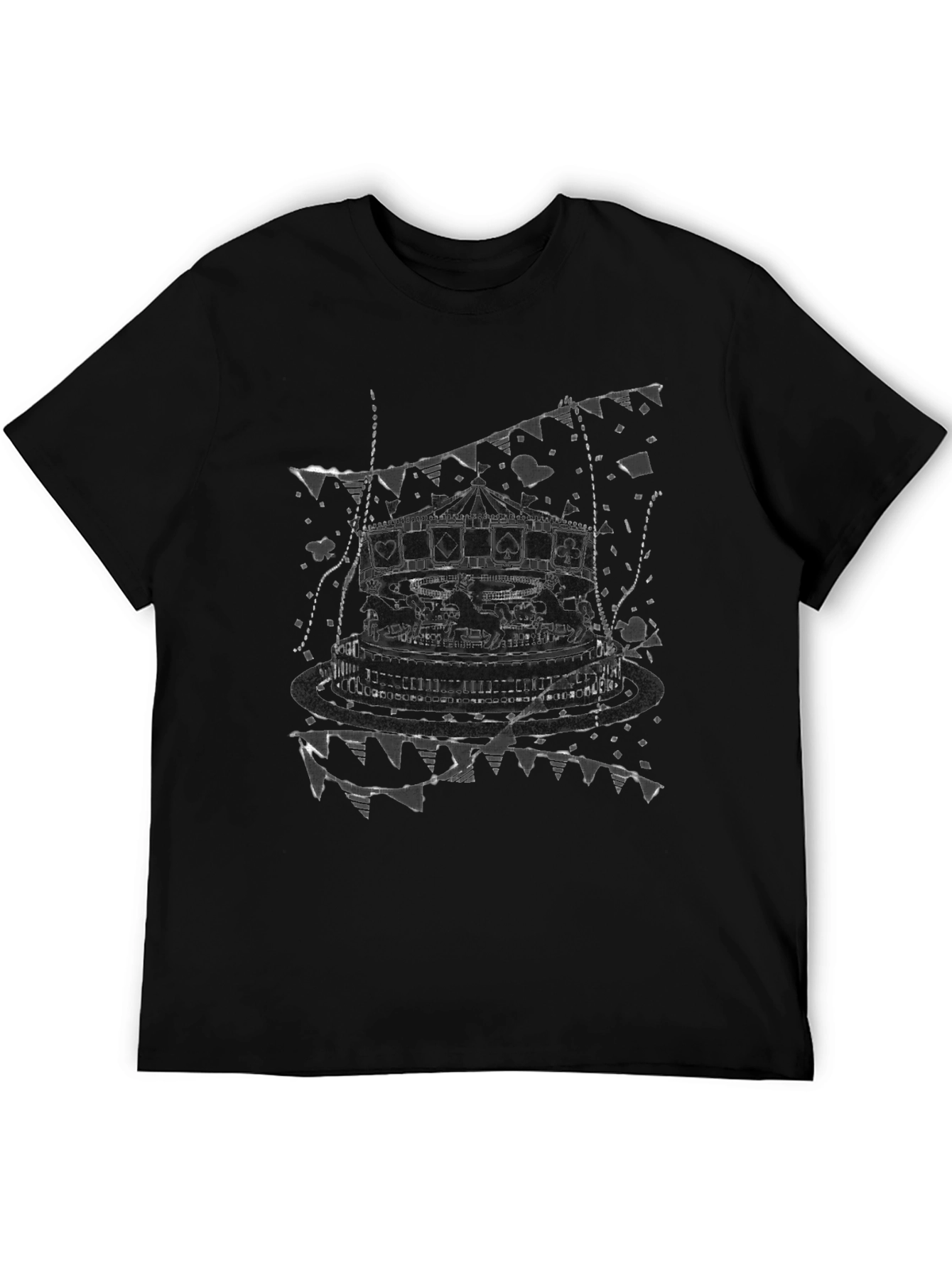 Step up your style with this unique black t-shirt featuring an intricate carousel graphic. The design is highly detailed, showcasing a vintage-inspired merry-go-round surrounded by festive banners and embellishments. Made from what appears to be a soft and breathable cotton blend, this tee offers both comfort and style. Perfect for casual outings, concerts, or expressing your individuality, this shirt is a versatile addition to any wardrobe. The monochrome graphic stands out against the dark fabric, ensuring you'll turn heads wherever you go. Dress it up with a jacket or keep it casual with jeans - either way, you'll look effortlessly cool.