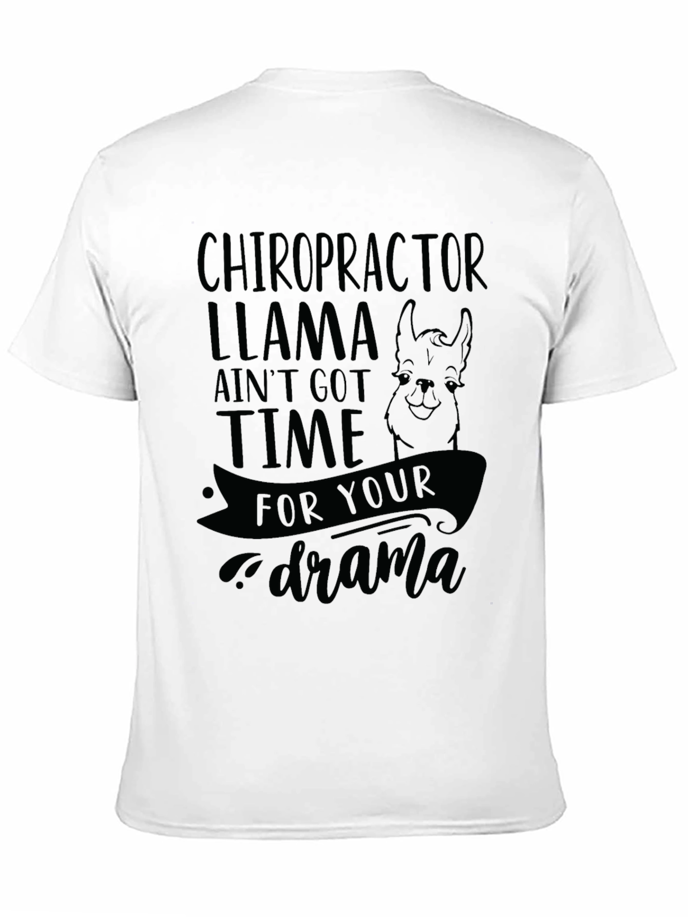 This black t-shirt features a humorous design perfect for chiropractors with a sense of humor. The print displays the words "CHIROPRACTOR LLAMA AIN'T GOT TIME FOR YOUR drama" in a stylish font, complete with an illustrated llama graphic. Made from soft, breathable fabric, this t-shirt ensures all-day comfort, whether you're in the office or out and about. The unique design makes it a great conversation starter and a fun way to show off your profession and personality. Wear it casually or give it as a thoughtful gift to your favorite chiropractor.