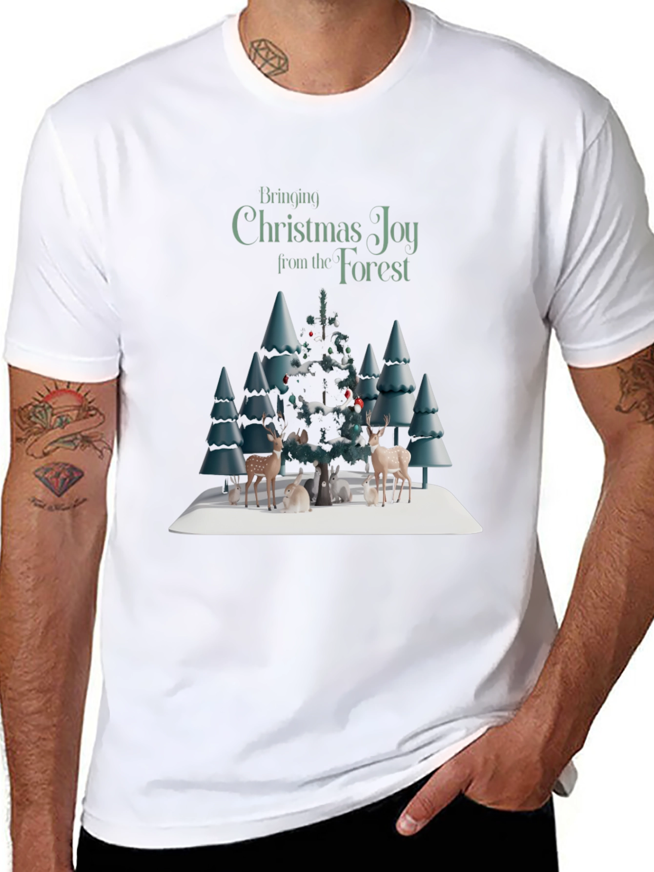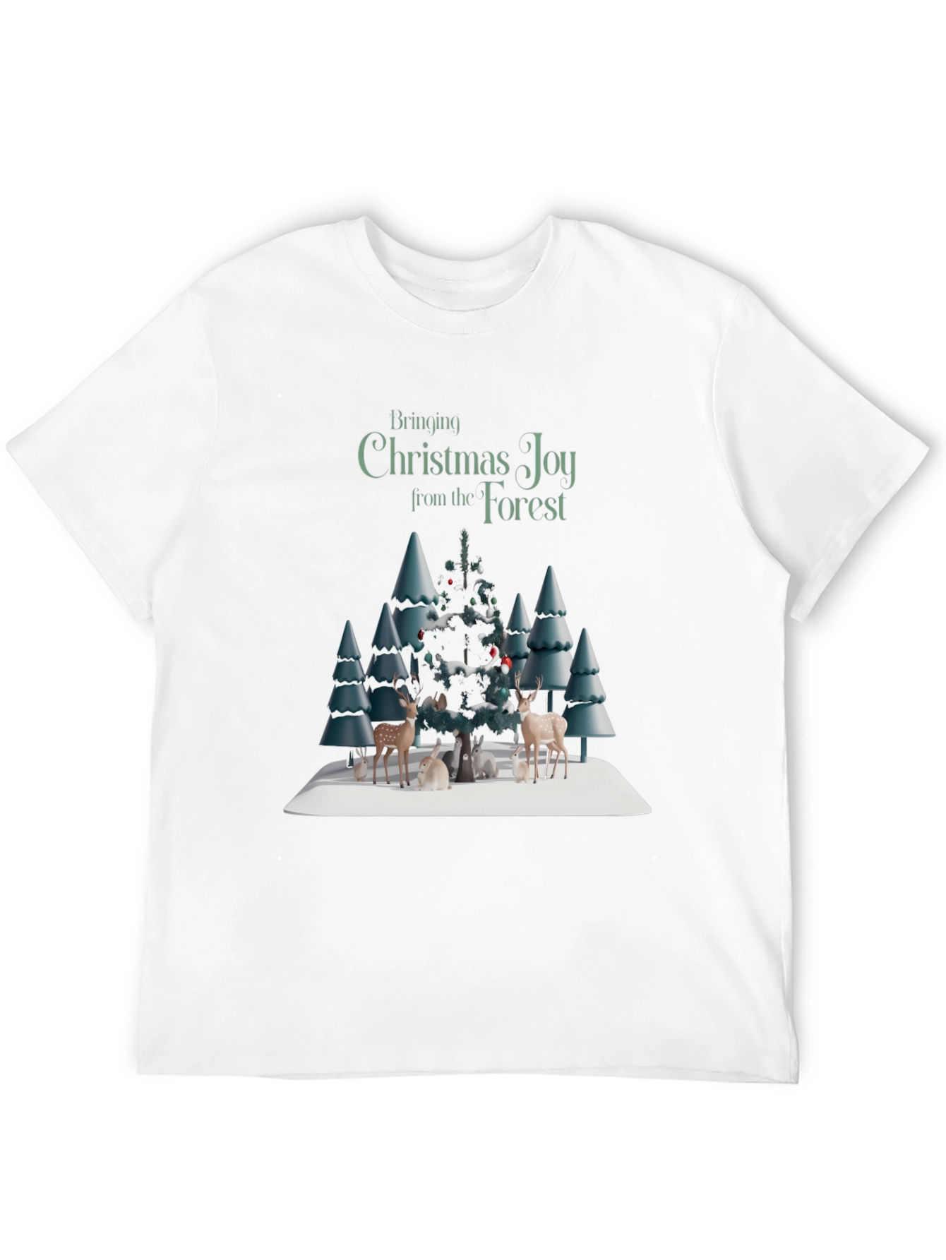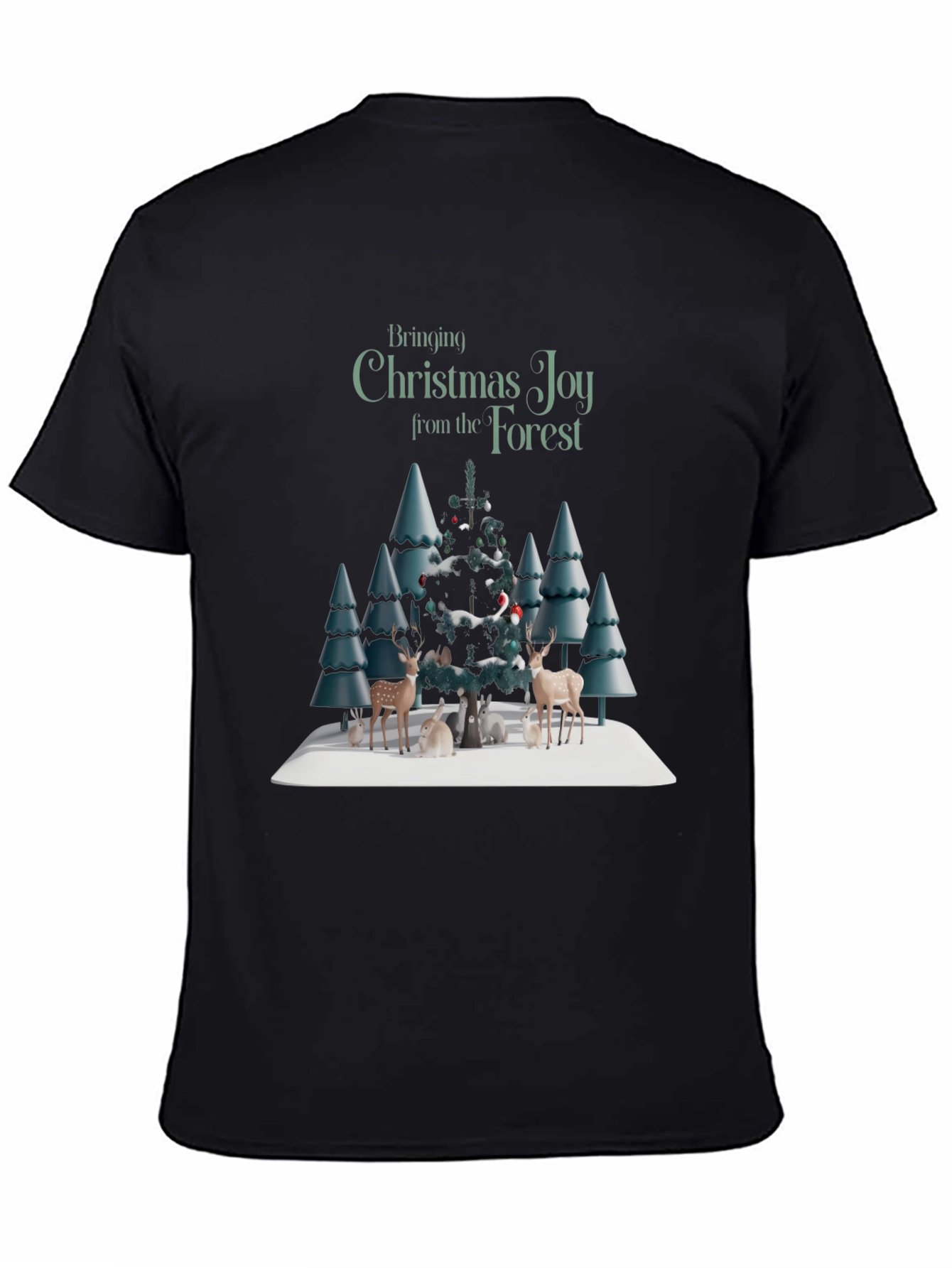 Embrace the holiday spirit with this festive graphic tee! This black t-shirt features a delightful winter forest scene, complete with snow-covered trees, charming deer, and playful rabbits gathered around a decorated Christmas tree. The words "Bringing Christmas Joy from the Forest" are printed above the festive scene. Perfect for casual wear, holiday gatherings, or as a thoughtful gift, this shirt is sure to spread cheer wherever you go. Made from a soft, comfortable fabric, this t-shirt offers both style and comfort. Add a touch of seasonal magic to your wardrobe!