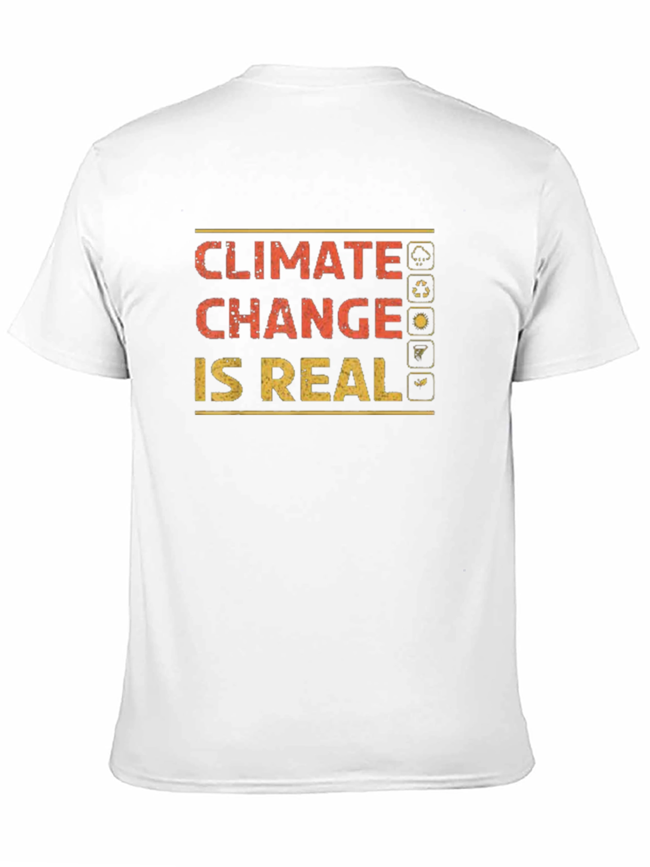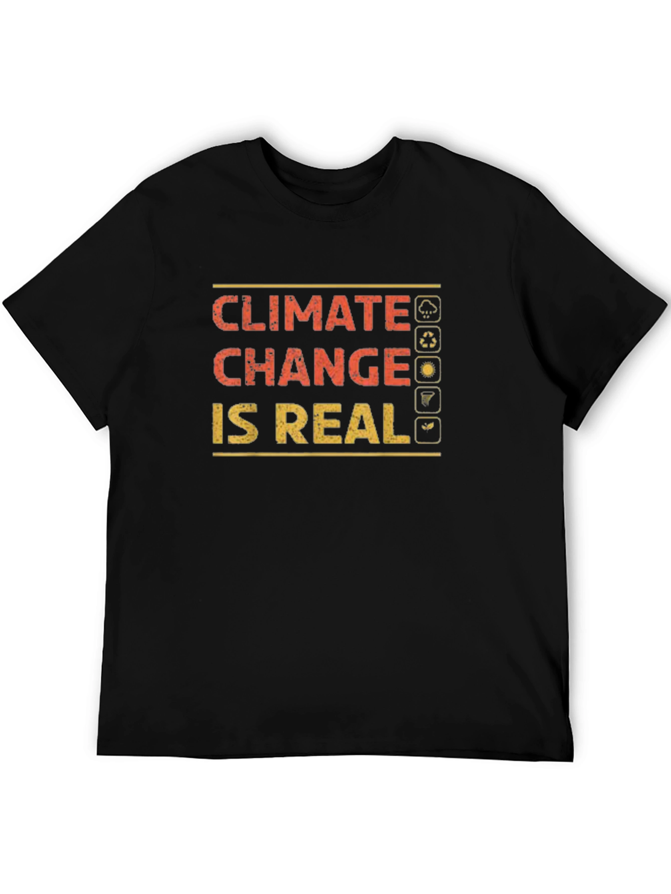 Spread an important message with this eye-catching black t-shirt. The design features a bold "CLIMATE CHANGE IS REAL" statement in orange and yellow. Each word is separated by lines. The graphic includes icons representing climate action: cloud/rain, recycling, the sun, and planting a seed. Made from a soft material, this tee offers all-day comfort. Its classic fit makes it ideal for casual wear. A perfect addition to your wardrobe for everyday activities or environmental events. Show your support for climate action in style!