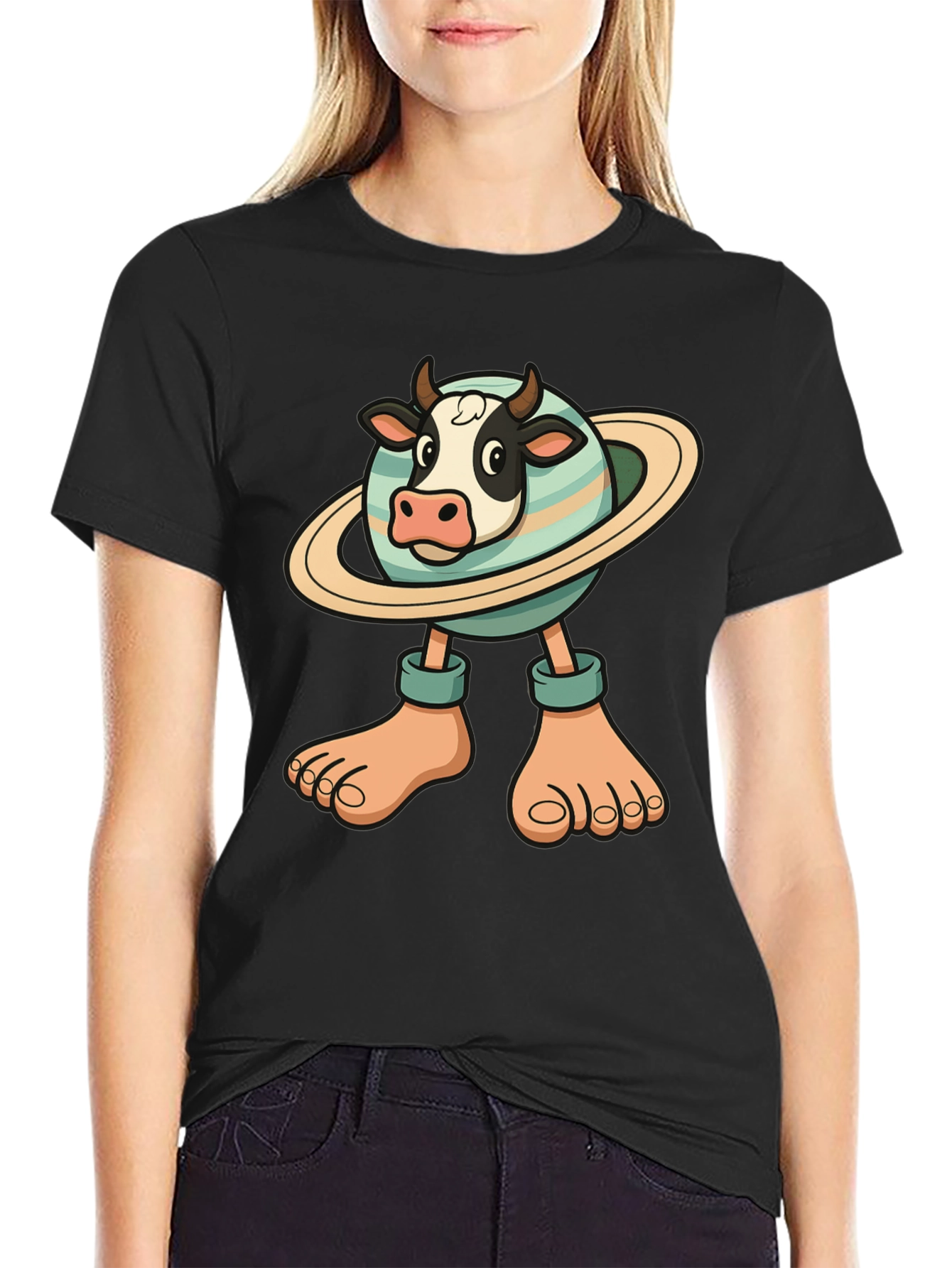 Show off your unique style with this eye-catching black t-shirt featuring a cartoon graphic of a cow with a planet body and rings! Made from a soft, comfortable fabric, this tee is perfect for everyday wear. The fun and quirky design is sure to turn heads and spark conversation. Ideal for casual outings, weekend adventures, or simply lounging at home. This tee offers a relaxed fit for ultimate comfort. A must-have for anyone who loves cows, space, or just standing out from the crowd!