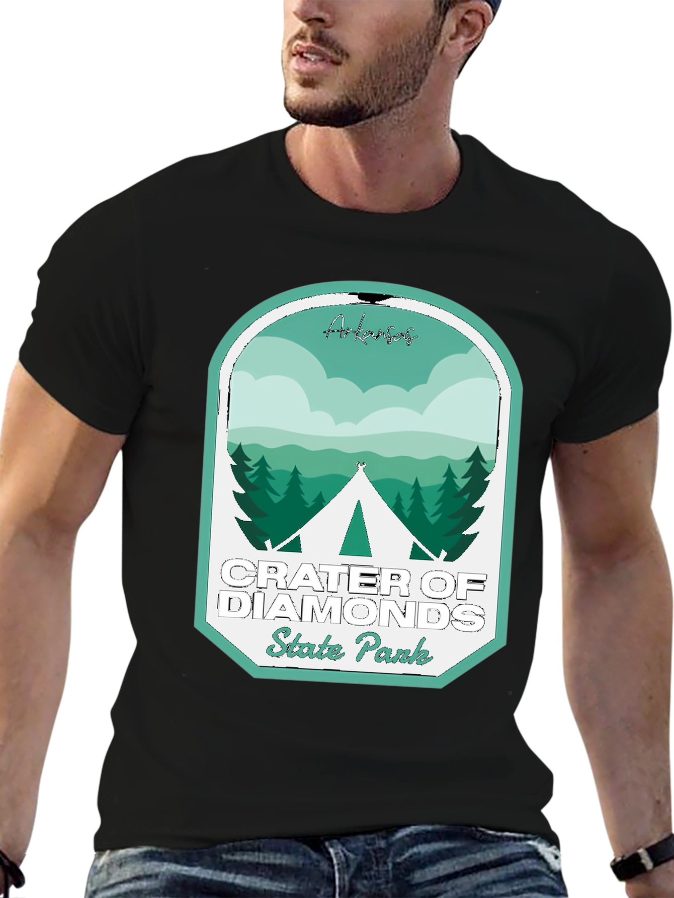 Show your love for the great outdoors with this stylish black t-shirt featuring a unique graphic design! The design showcases a vintage-inspired emblem representing Crater of Diamonds State Park with beautiful green-toned forest and mountain scenery. Perfect for casual wear or a memorable souvenir for your next camping trip, the shirt offers both comfort and style. The design features the words 'Crater of Diamonds State Park'. The classic black color makes it easy to pair with any outfit. Grab yours today and let the adventure begin!