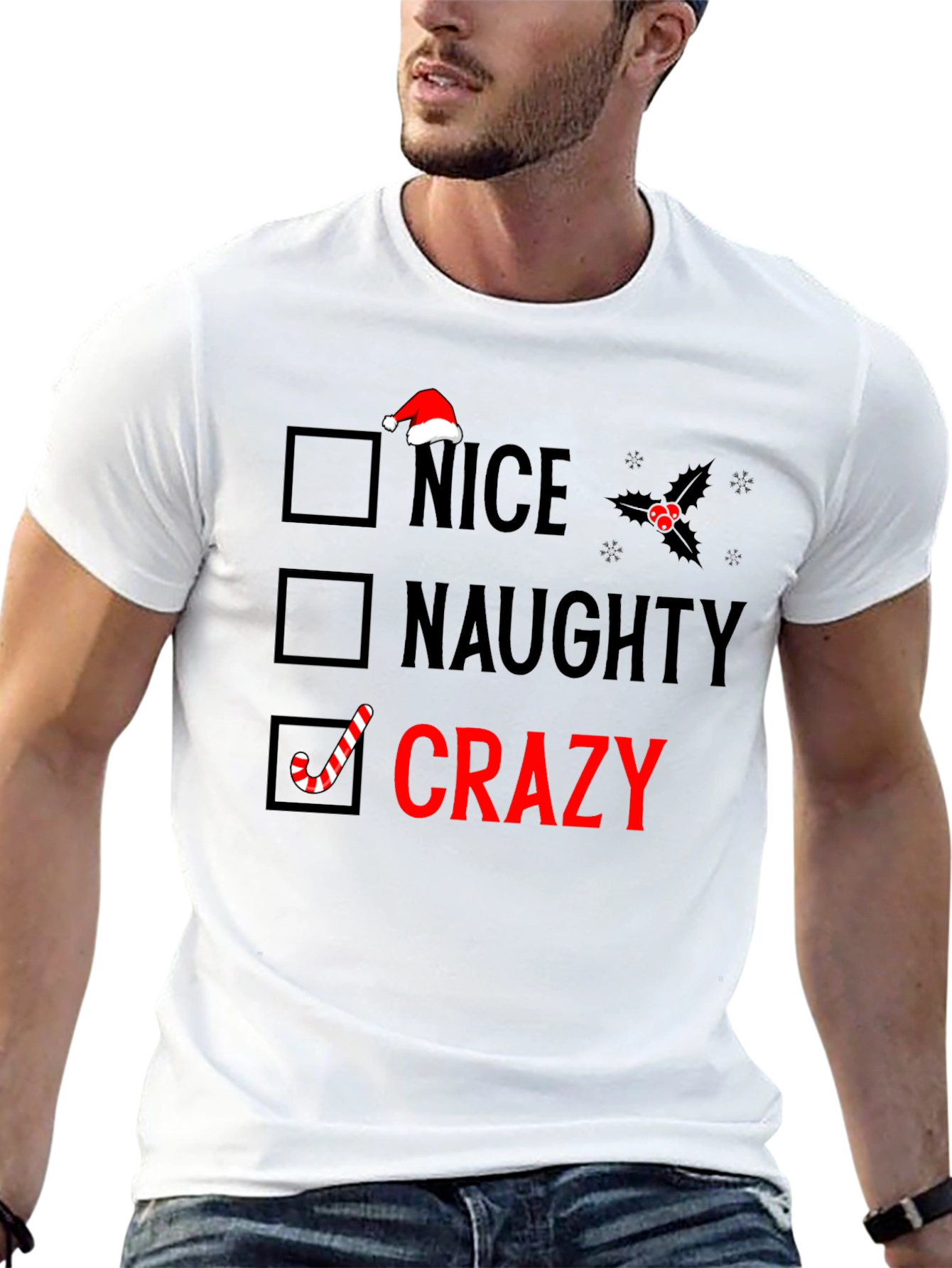 Embrace your wild side this holiday season with our "Crazy" Christmas T-shirt! Made from soft, breathable black fabric, this tee features a festive design with "Nice, Naughty, Crazy" check boxes. A Santa hat accents "Nice", mistletoe accents "Naughty", and a candy cane marks "Crazy", adding a playful touch. Perfect for holiday parties, casual gatherings, or simply showing off your festive, quirky spirit. Get ready to spread some laughter and holiday cheer with this unique and eye-catching shirt!