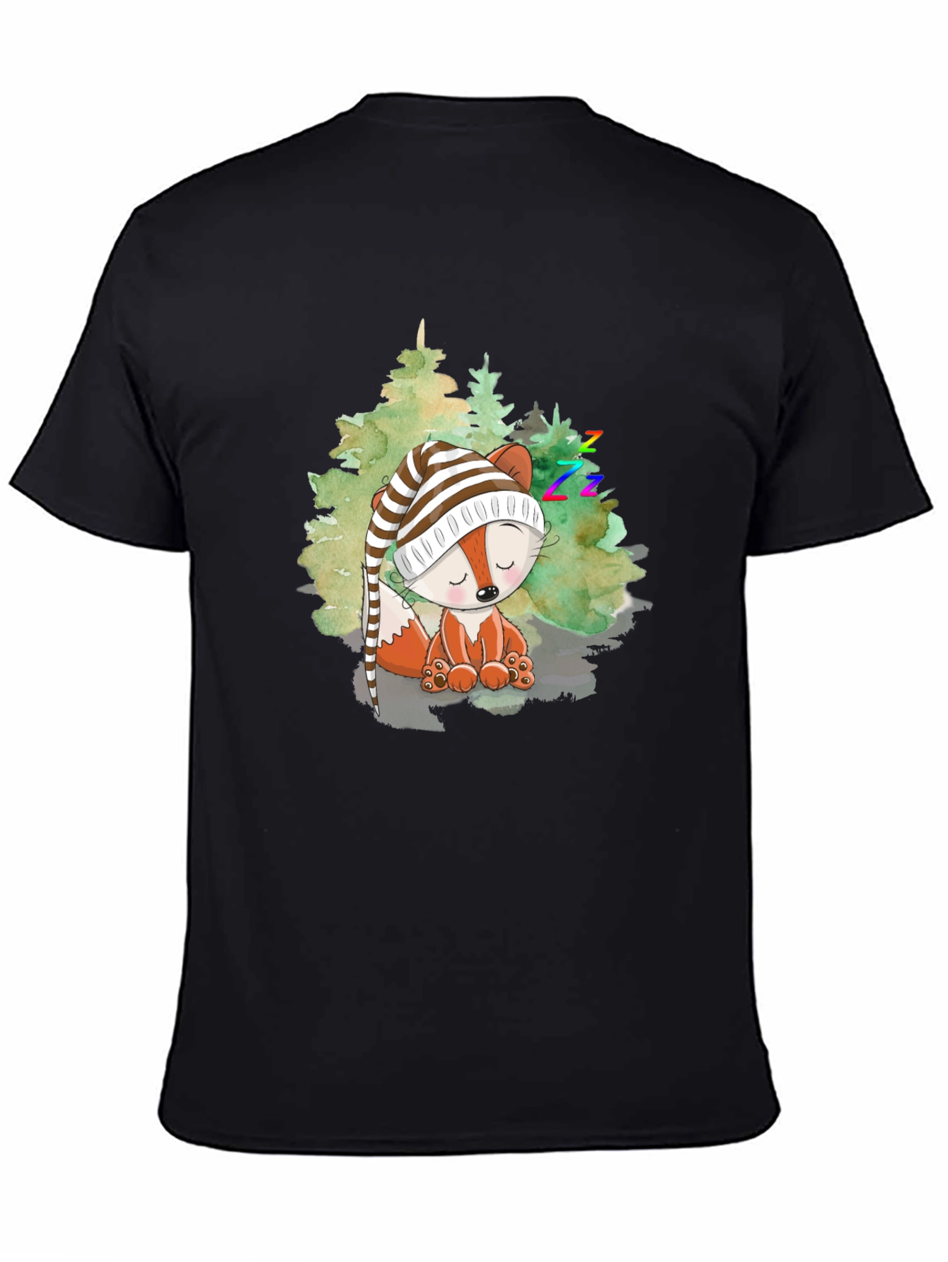 This black t-shirt features an adorable cartoon fox wearing a striped sleeping cap nestled among green pine trees. With its eyes closed and a peaceful expression, the fox gives a calming and cute vibe. 'Zzz' graphics float above the fox's head to complete the theme. Made from what appears to be a soft, breathable fabric, this casual tee is perfect for everyday wear. It’s an ideal choice for anyone who loves whimsical designs and wants to showcase their playful side. Great for lounging, casual outings, or as a cozy sleep shirt.