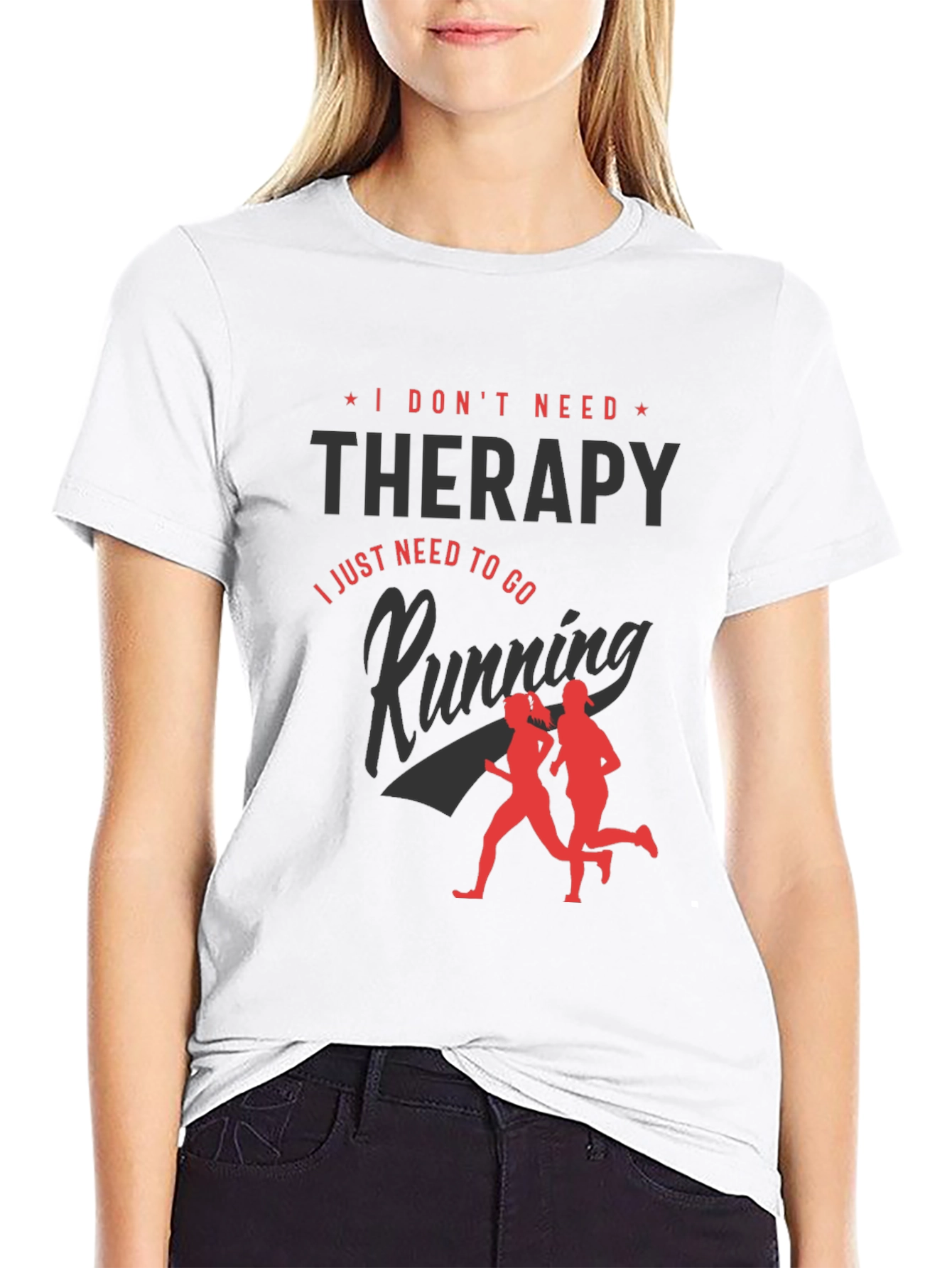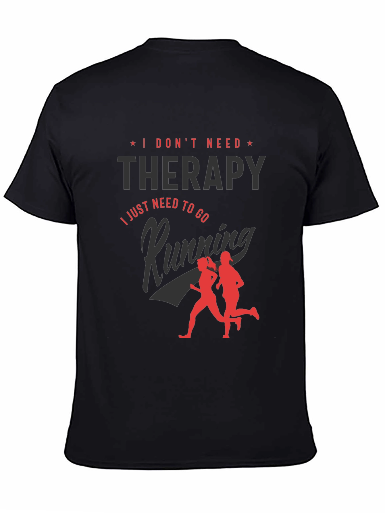 This stylish black t-shirt features a witty graphic design that's perfect for runners and fitness enthusiasts. The print states "I DON'T NEED THERAPY I JUST NEED TO go Running" in a combination of bold and script fonts, accompanied by the silhouette of two runners. Made from a comfortable-looking fabric, this tee is ideal for casual wear, workouts, or simply expressing your love for running. Show off your passion for the sport with this eye-catching and humorous design. This t-shirt would also make a great gift for the runner in your life.