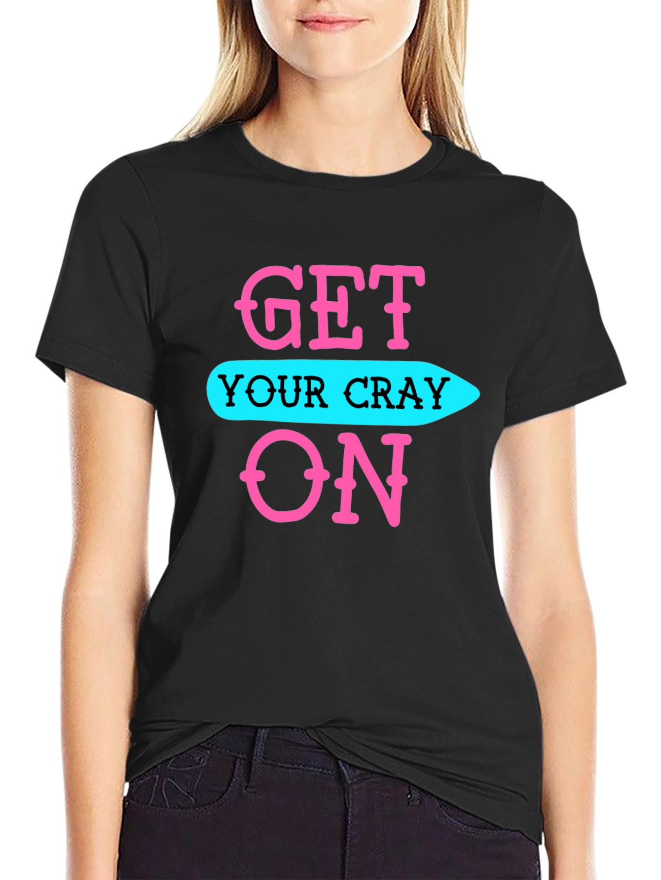 Unleash your inner artist with this vibrant black graphic tee! The shirt features the playful phrase 'Get Your Cray On' in eye-catching pink lettering, separated by a turquoise crayon graphic. Made from a soft, comfortable fabric, this tee is perfect for expressing your creative spirit or simply adding a pop of color to your everyday style. Whether you're heading to an art class, casual outing, or just want to make a statement, this tee is sure to turn heads and spark conversation. Embrace your colorful side and let your creativity shine!