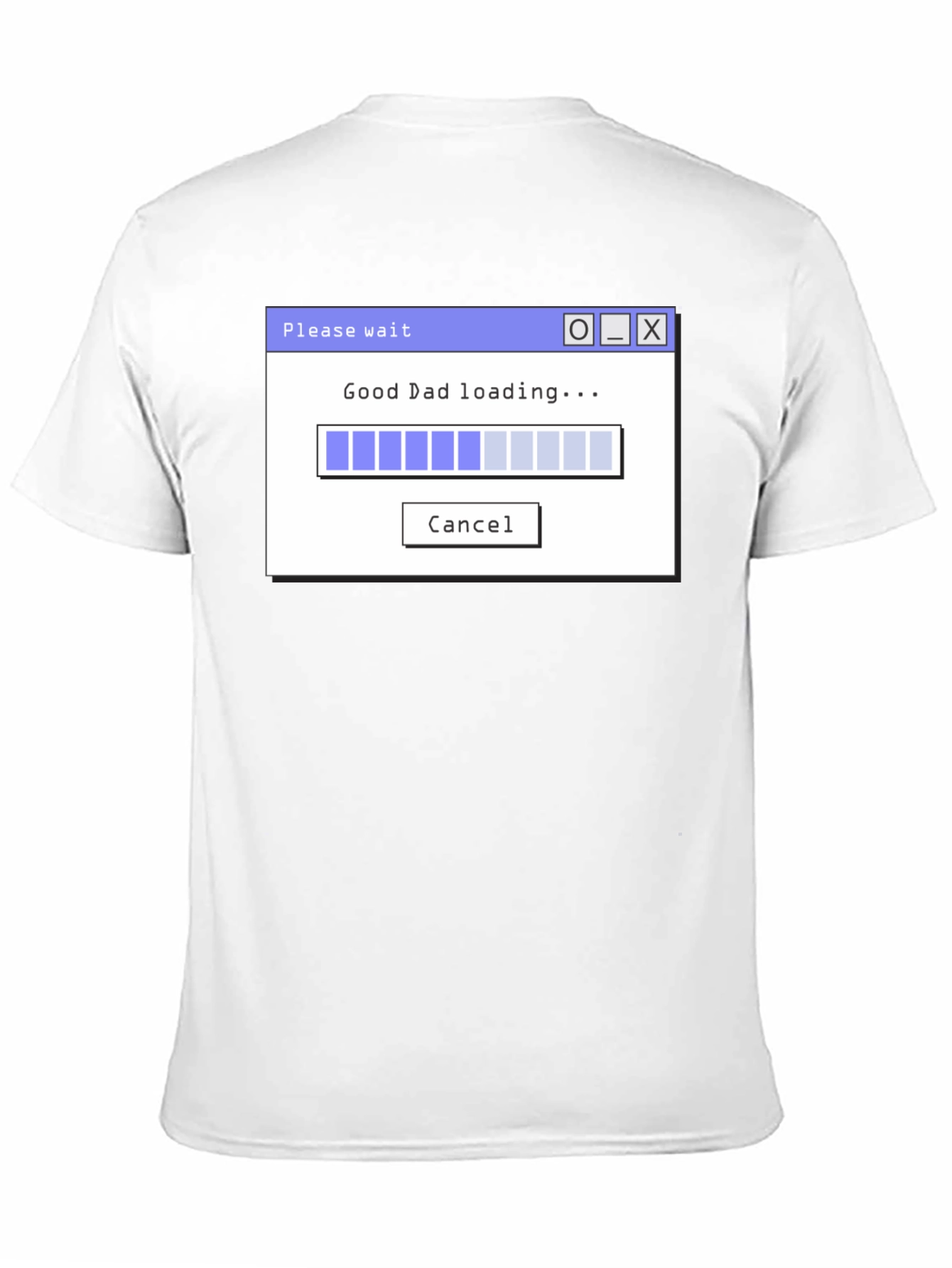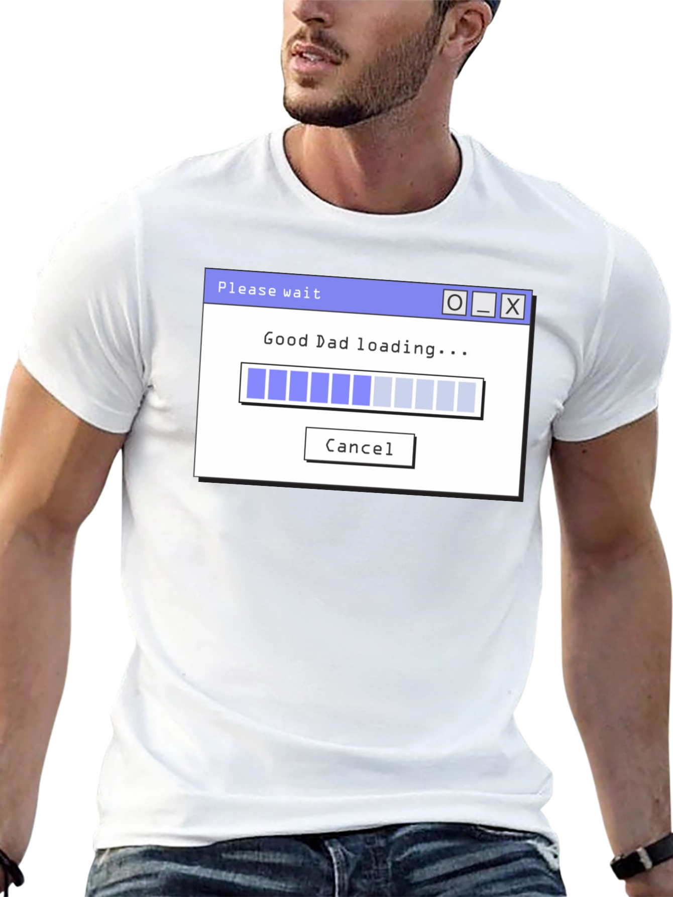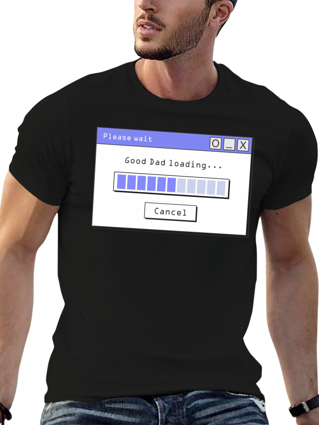 This black t-shirt features a humorous graphic that is perfect for any dad with a sense of humor. The design is a retro-style loading window with the text 'Good Dad loading...', complete with a progress bar and a 'Cancel' button. It's a clever nod to computer interfaces and makes for a unique and eye-catching design. Made from what appears to be a soft and comfortable fabric, this tee is ideal for casual wear, Father's Day, birthdays, or as a fun gift for a new dad. Its classic fit and simple design ensure that it can be paired easily with jeans, shorts, or any casual bottom. Show off your dad's tech-savvy side with this funny and stylish t-shirt!