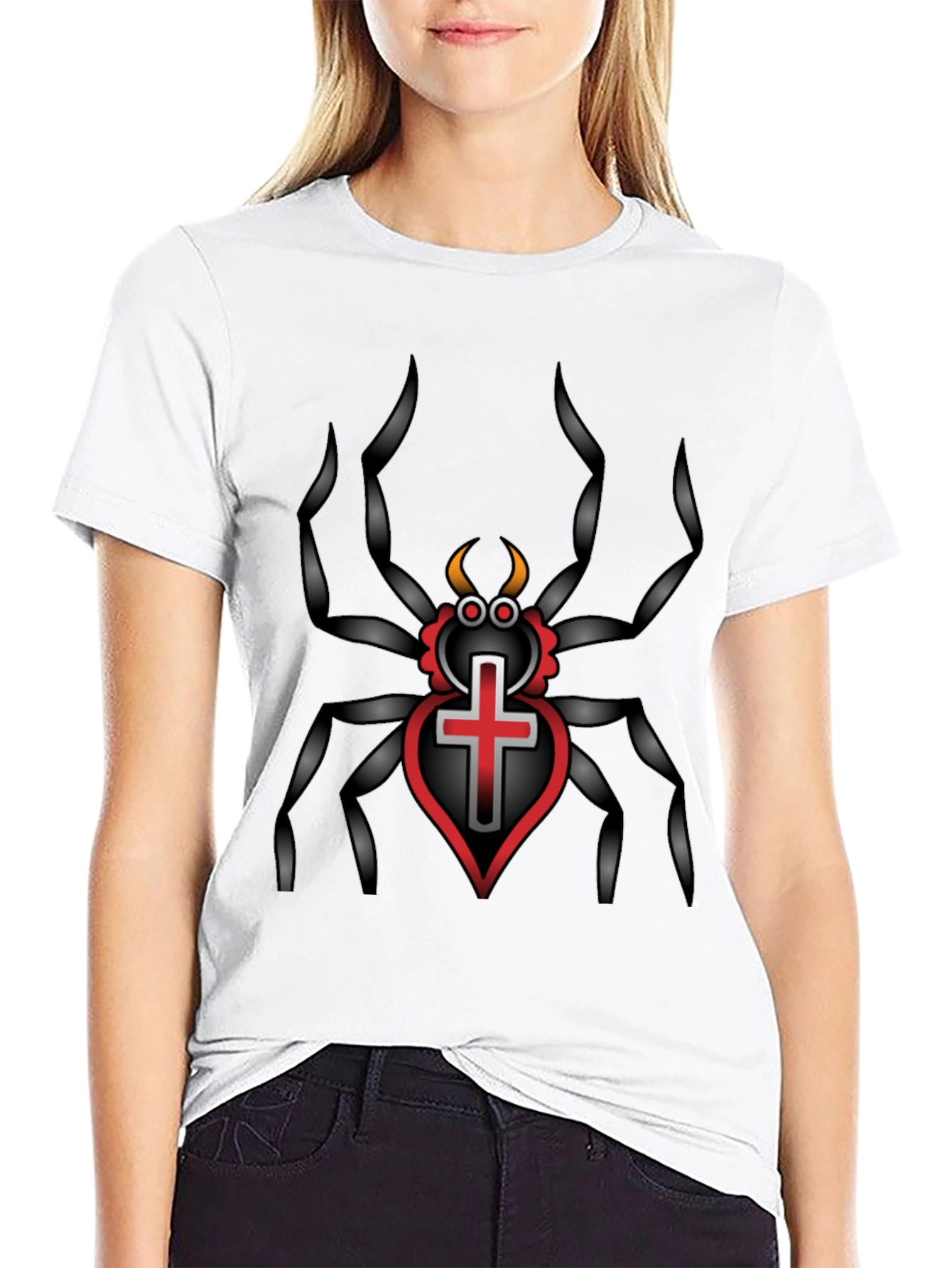 This unique black t-shirt features a bold and eye-catching design. A stylized black spider with articulated legs is emblazoned across the front, adorned with a striking red heart and cross emblem. The spider's orange eyes and subtle red accents create a visually appealing contrast. Crafted from comfortable, breathable fabric, this shirt is perfect for expressing your individual style. Ideal for casual wear, themed events, or as a statement piece, this t-shirt is sure to turn heads. Show off your alternative fashion sense with this distinctive gothic-inspired tee.