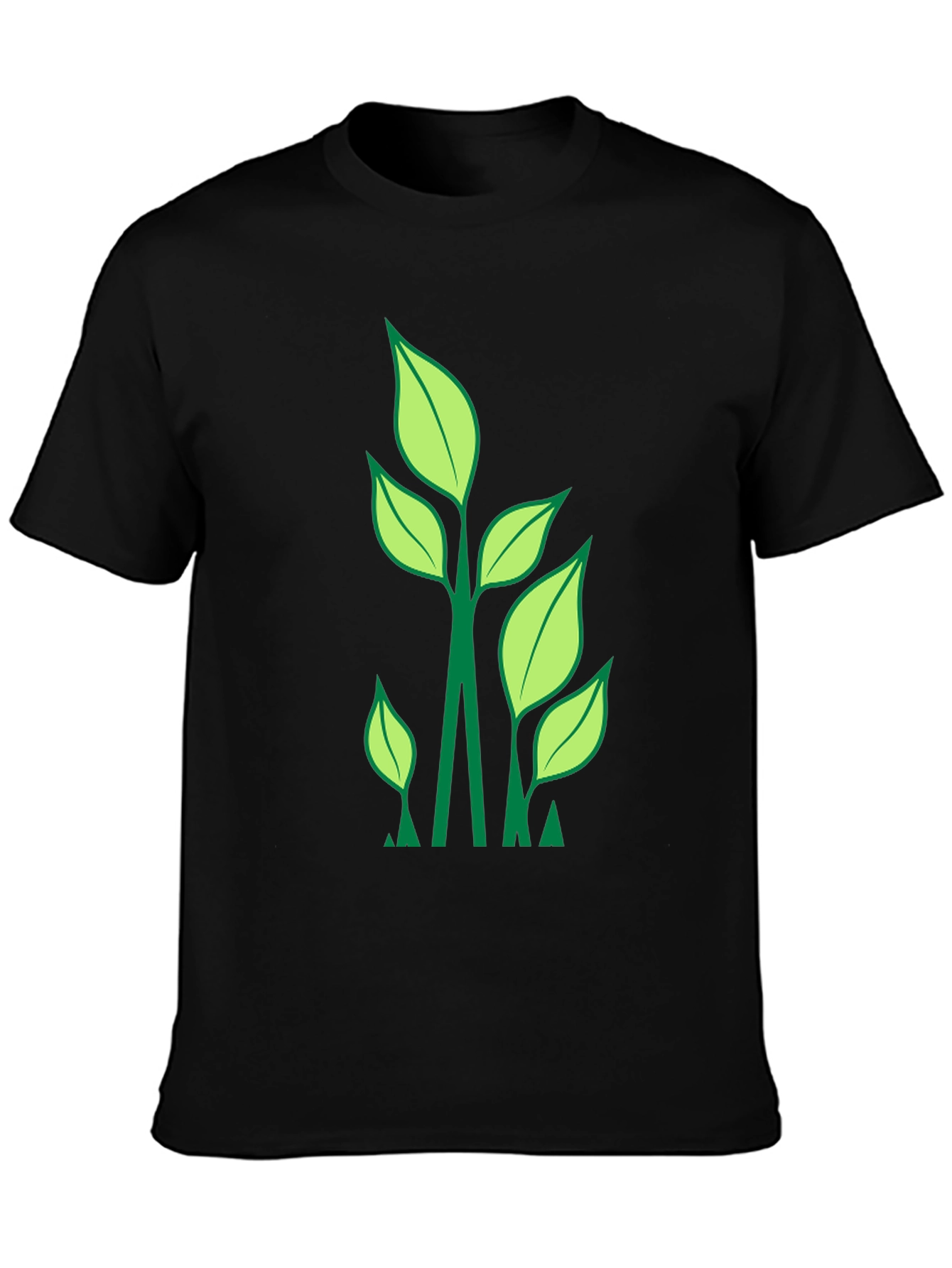 Show your love for nature with this stylish black t-shirt. Featuring a vibrant green sprout graphic, this tee is perfect for everyday wear. The design showcases multiple leaves in various sizes, creating a visually appealing and modern aesthetic. Made from a comfortable material, this shirt is ideal for casual outings, nature walks, or simply lounging around. Its simple yet eye-catching design will surely make a statement. Pair it with jeans or shorts for a relaxed look.