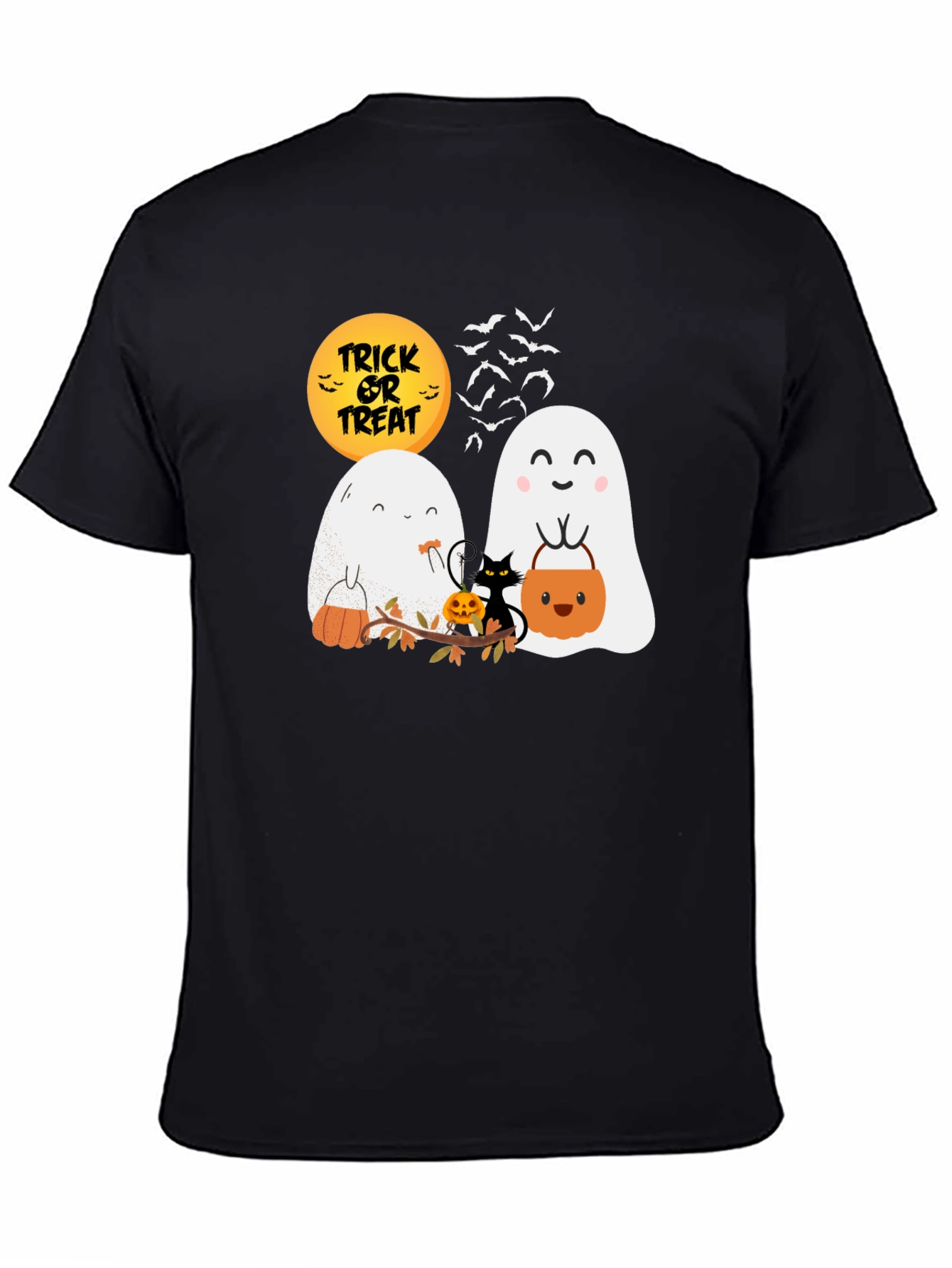 Get ready for Halloween with this adorable graphic t-shirt. The black tee features two friendly ghosts, a black cat, and a smiling pumpkin. The "Trick or Treat" design adds a festive touch, perfect for parties, events, or casual wear. The playful and spooky design makes it a must-have for Halloween enthusiasts. Made from soft, breathable fabric, this shirt offers all-day comfort. Show off your love for the Halloween season in style. Makes a great gift!