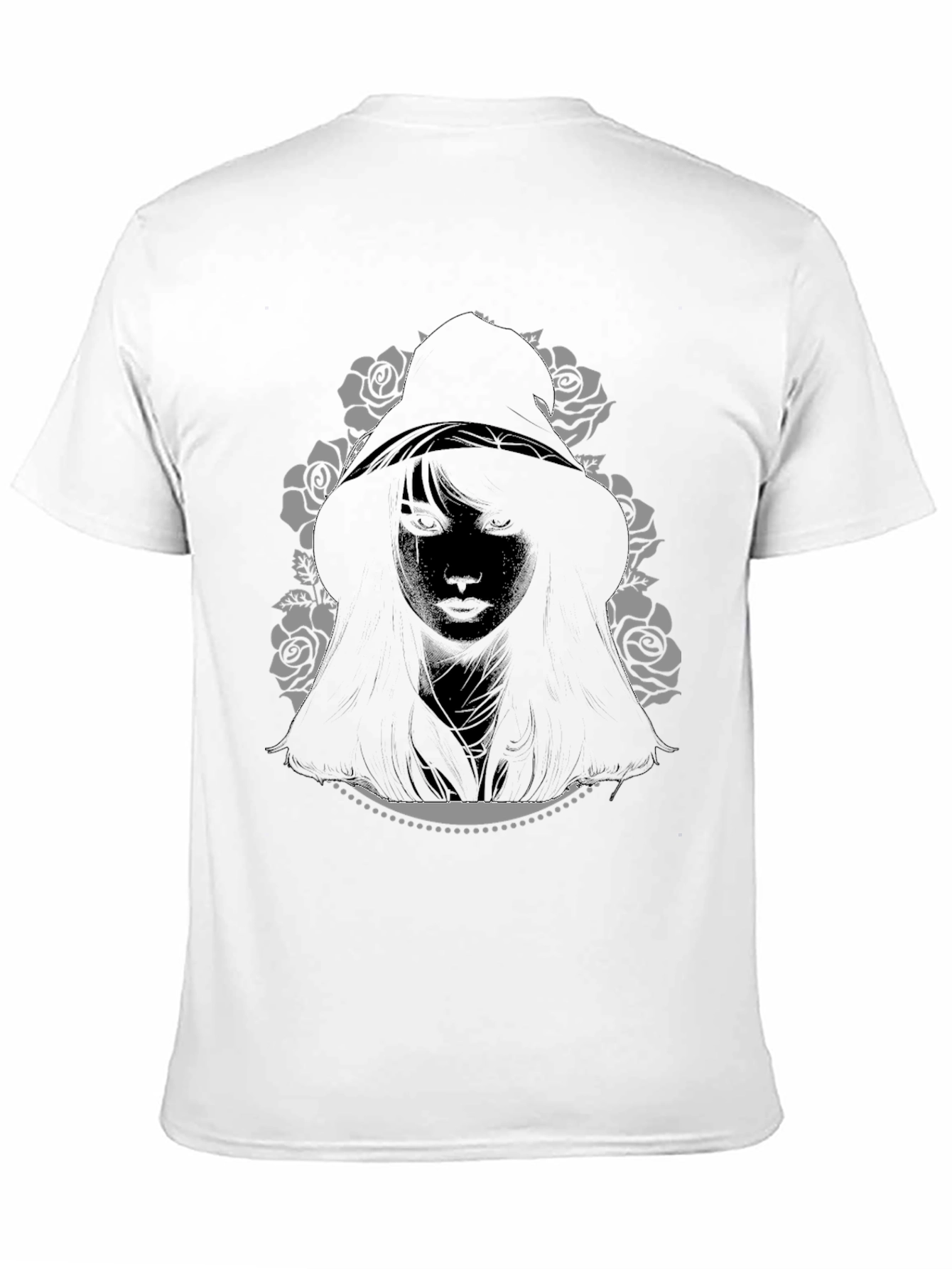 Showcase your unique style with this striking black t-shirt. The tee features a captivating graphic of a hooded woman surrounded by roses, offering a blend of mystery and elegance. The soft fabric ensures comfort, making it perfect for everyday wear or special occasions. Make a bold statement with this tee, perfect for casual outings, concerts, or lounging at home. Its unique design is sure to turn heads and spark conversations. Add this one-of-a-kind piece to your wardrobe today and express your individuality.