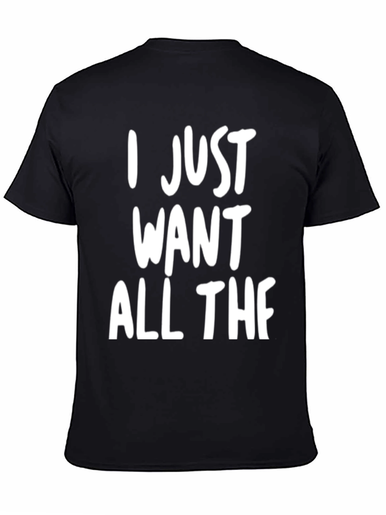 Show off your casual style with this eye-catching graphic tee. The shirt features bold white text that reads 'I JUST WANT ALL THE' making a humorous statement. The design is printed on a classic black, short-sleeved tee. Perfect for everyday wear, this tee can be paired with jeans, shorts, or even dressed up with a blazer. The simple yet impactful design makes it a great conversation starter and a fun addition to any wardrobe. Great for casual outings, social gatherings, or just relaxing at home.