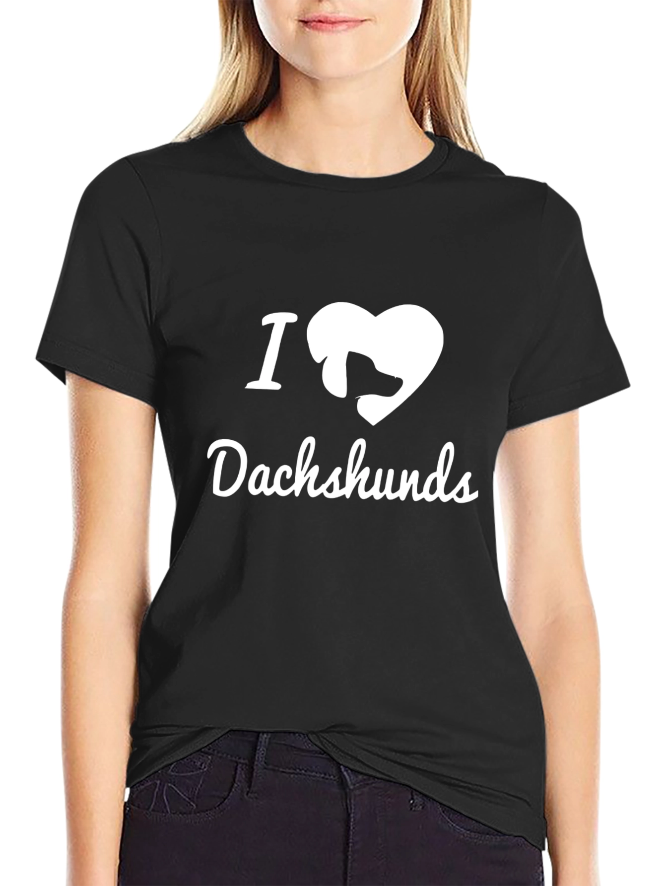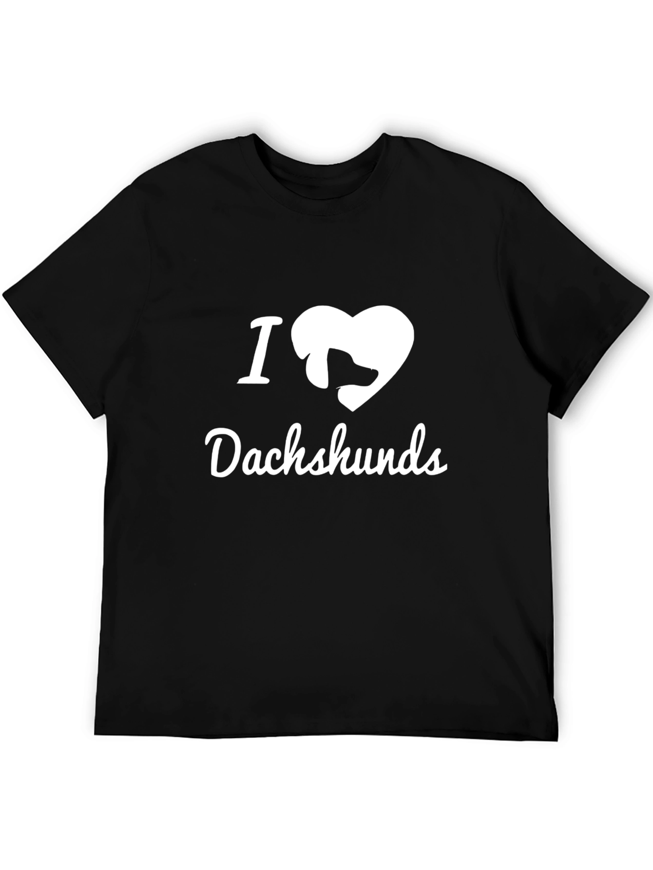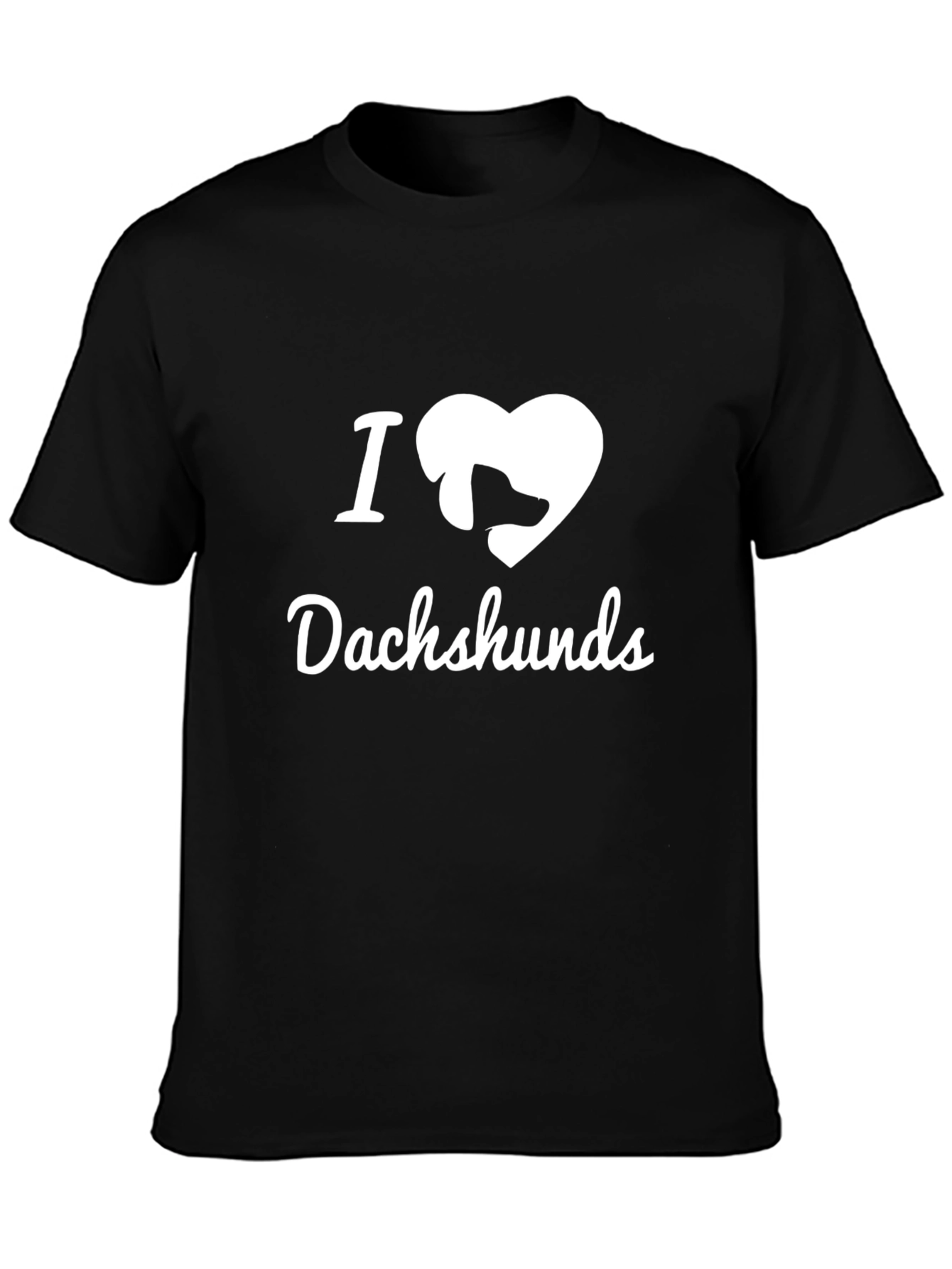 Show your love for Dachshunds with this stylish black t-shirt. The design features a playful "I Heart Dachshunds" graphic in white, with the heart cleverly incorporating a Dachshund silhouette. Made from a comfortable fabric, this tee is perfect for everyday wear. Whether you're a Dachshund owner or just a fan of the breed, this t-shirt is a great way to express your passion. Ideal for casual outings, dog park visits, or simply lounging at home. This comfortable and unique tee is a must-have for any dog lover's wardrobe!
