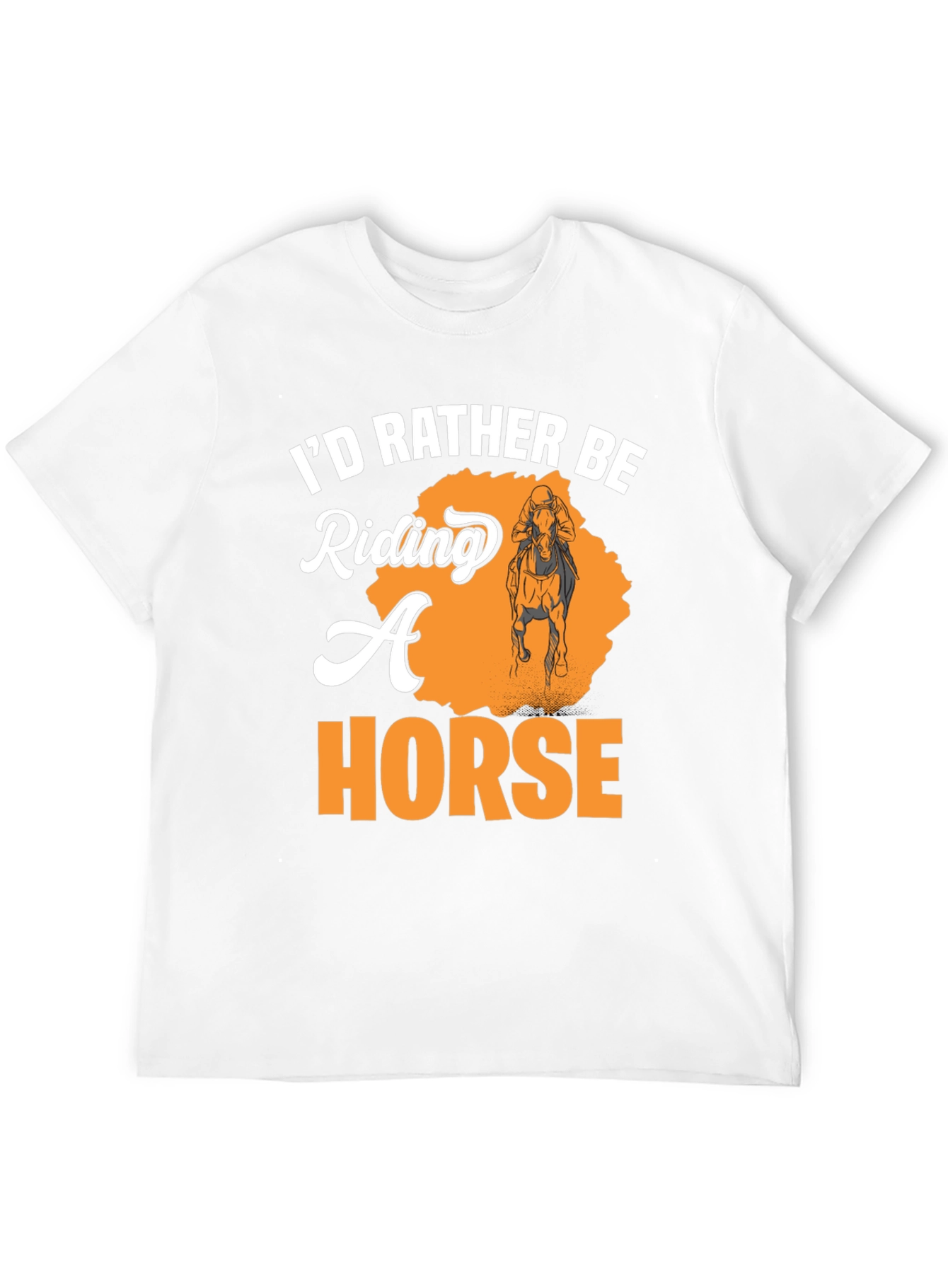 Show off your love for equestrian sports with this stylish black t-shirt. Featuring a bold graphic print, the shirt reads "I'd Rather Be Riding A Horse" in white and orange lettering. A detailed illustration of a horse and rider adds an authentic touch. Made from comfortable and breathable fabric, this tee is perfect for casual wear or a day at the stables. Makes a great gift for horse lovers and riders alike.