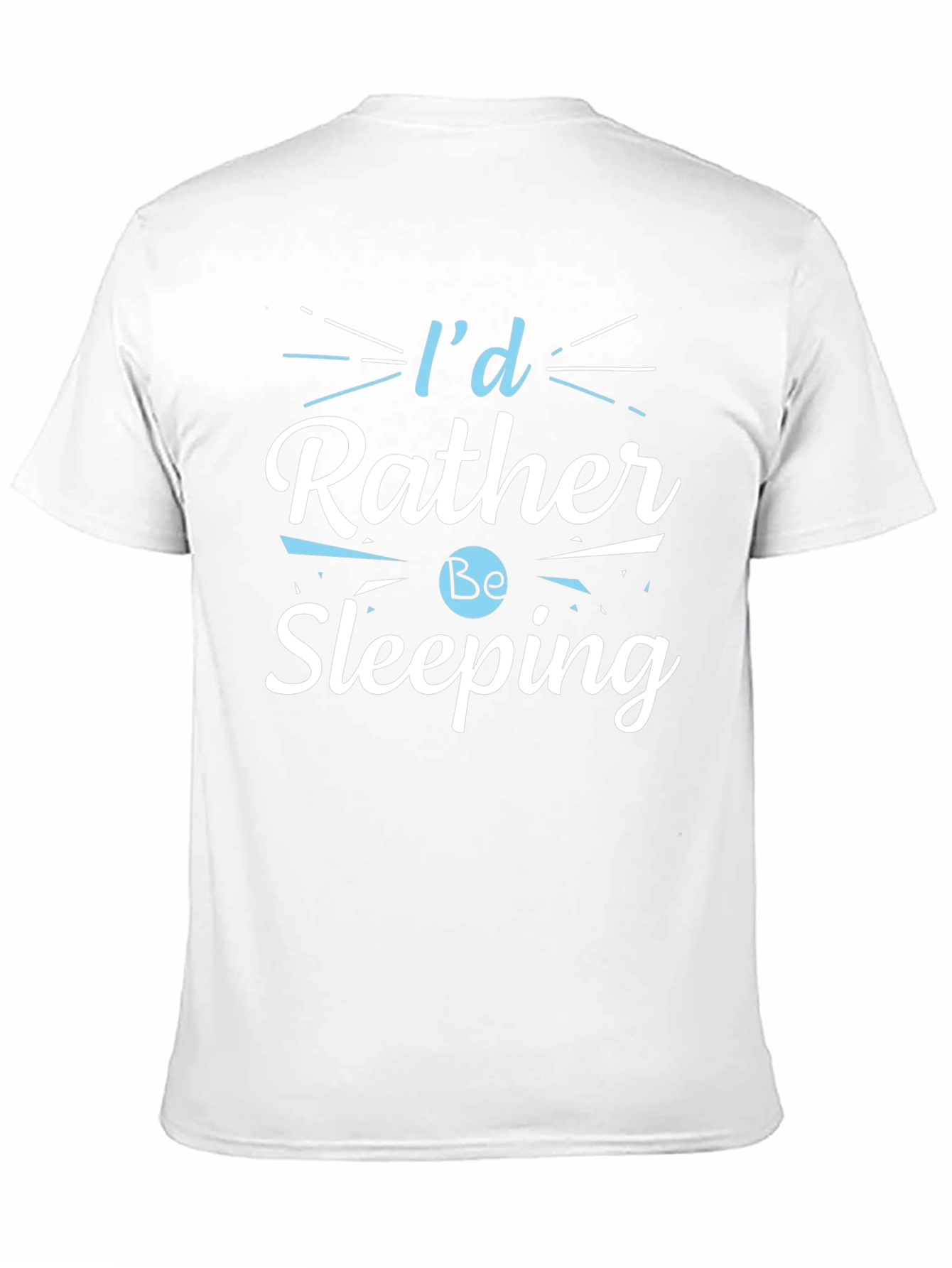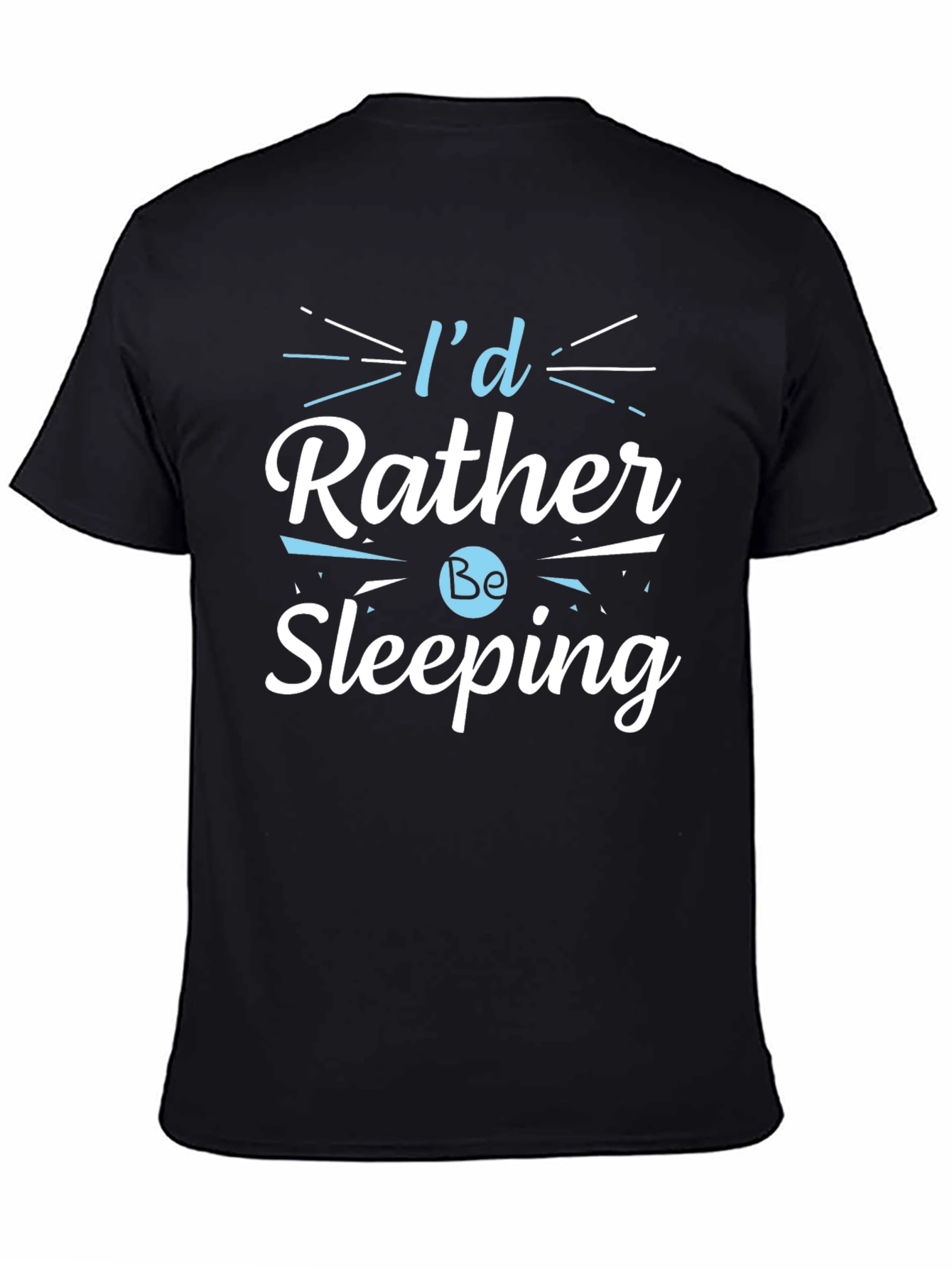 This stylish black t-shirt features a playful and relatable design that reads "I'd Rather Be Sleeping" in a mix of white and light blue fonts. The fun graphic is accented with starburst-like elements, giving it a modern and eye-catching appeal. Made from what appears to be a soft and breathable fabric, this t-shirt offers both comfort and style. Ideal for casual wear, lounging at home, or expressing your love for sleep, this shirt makes a statement. It can be paired with jeans, shorts, or even pajama bottoms for a relaxed look. This tee is perfect for anyone who loves to catch some Z's.