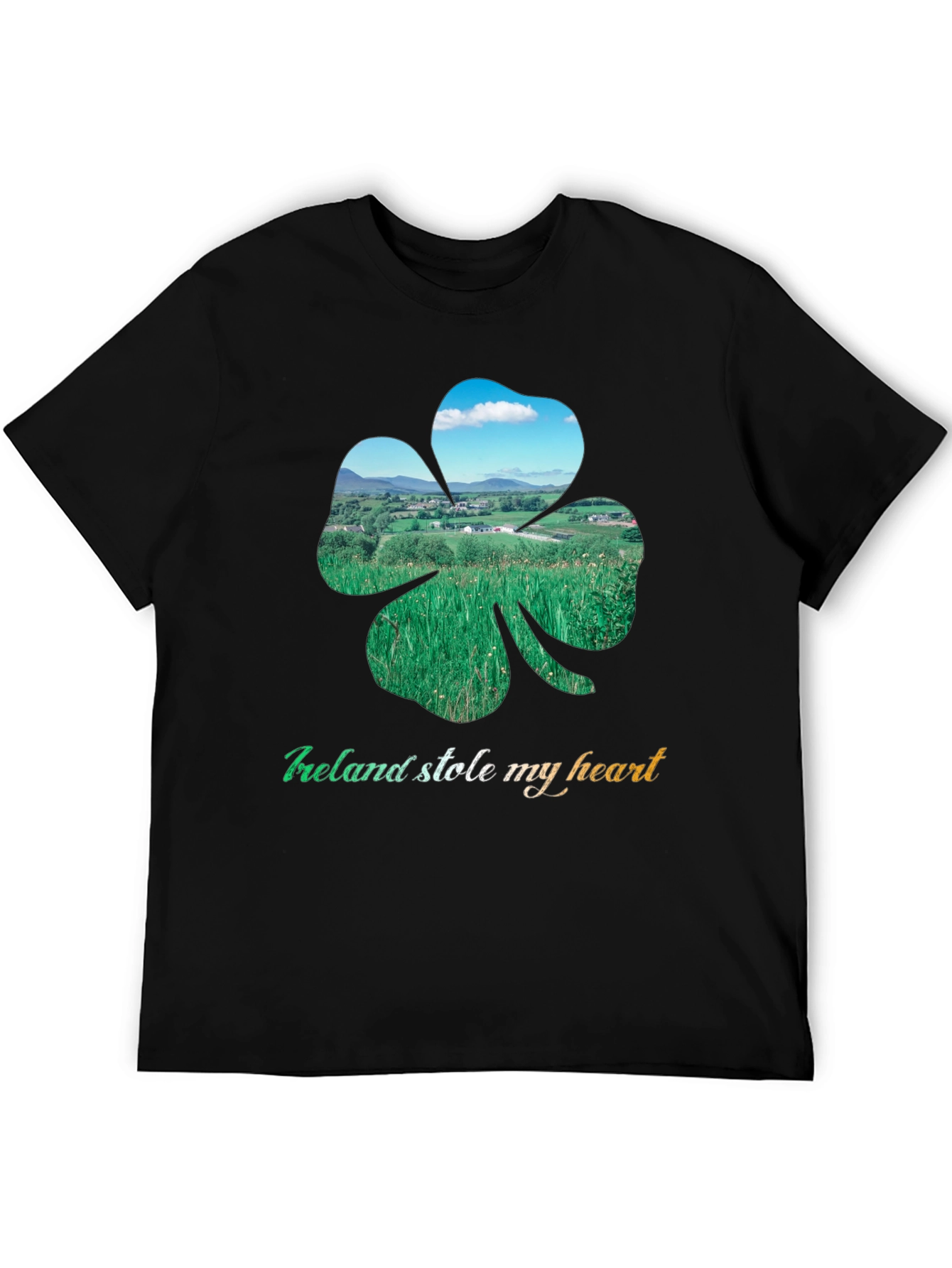Show off your love for the Emerald Isle with this eye-catching black t-shirt. The shirt features a striking shamrock design filled with a beautiful Irish landscape, creating a unique and vibrant visual. Below the shamrock, the phrase "Ireland stole my heart" is elegantly displayed in a gradient of green and gold. Crafted from a comfortable-looking fabric, this tee is perfect for casual wear, St. Patrick's Day celebrations, or as a souvenir for anyone who's fallen in love with Ireland. Express your Irish pride in style and comfort with this memorable t-shirt.