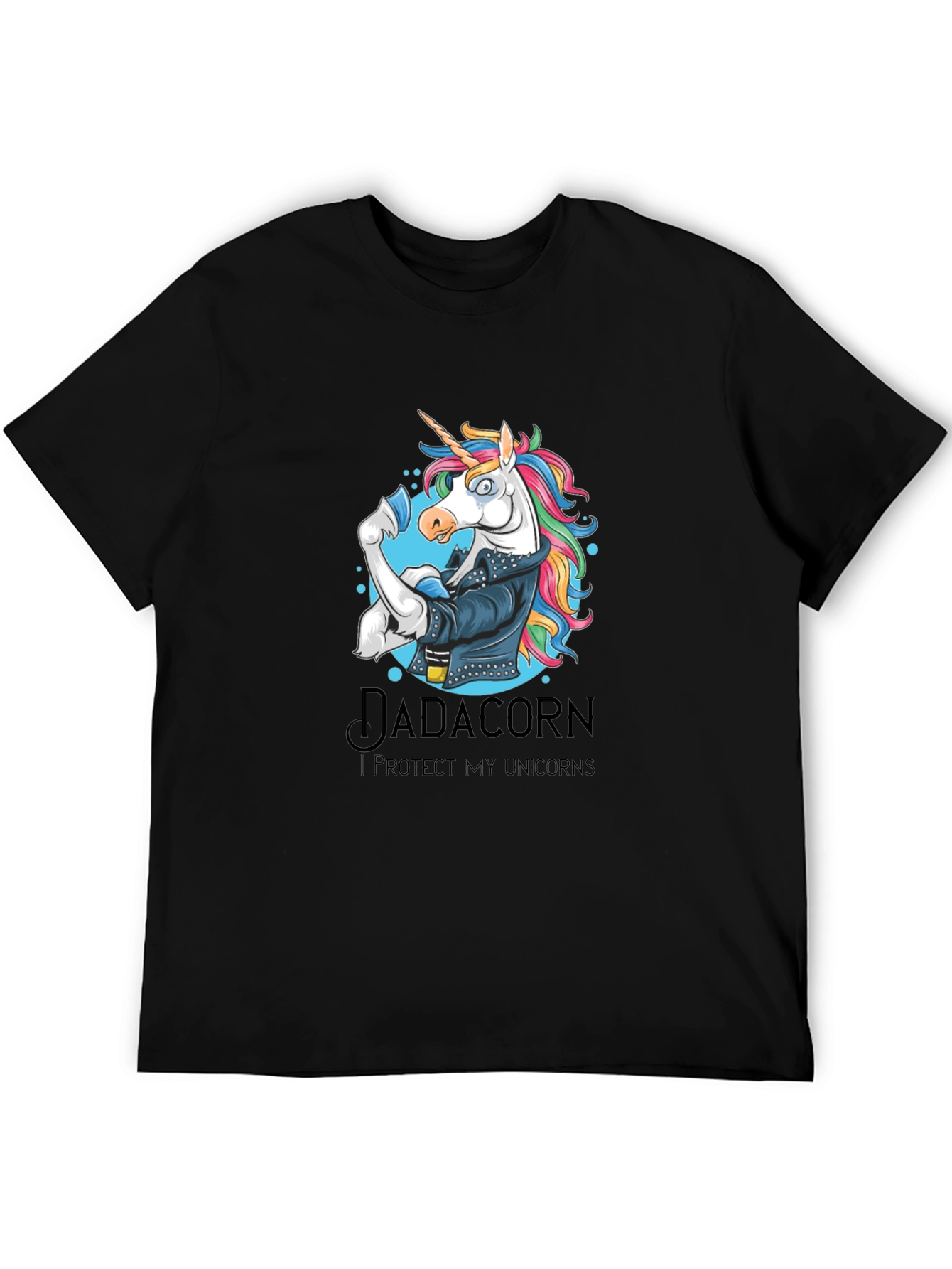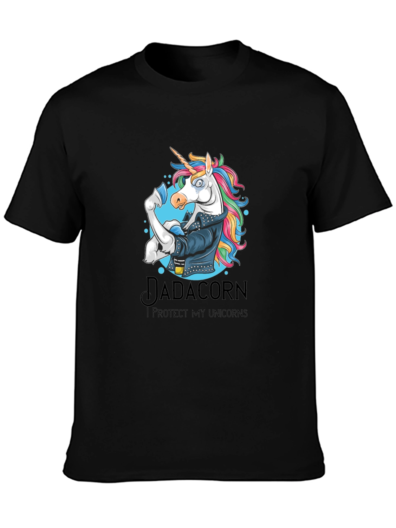 Show your love for unicorns with this unique Jadacorn t-shirt! The black tee features a bold graphic of a muscular unicorn wearing a studded jacket, flexing its arm. The design is vibrant with rainbow colored mane and a golden horn. The phrase "I PROTECT MY UNICORNS" adds a fun, empowering message. This eye-catching shirt is perfect for casual wear, unicorn-themed events, or expressing your quirky personality. Made from soft, comfortable fabric, this tee is sure to become a favorite in your wardrobe. Get yours today and stand out from the crowd!