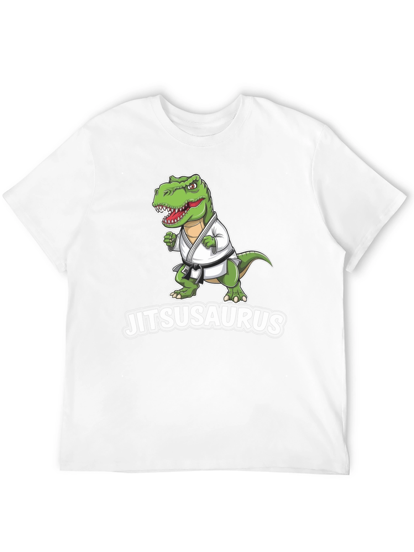 Show off your love for Jiu Jitsu with this awesome Jitsusaurus T-shirt! Featuring a cartoon T-Rex wearing a white gi and black belt, this tee is perfect for any martial arts enthusiast. The design is printed on a soft, comfortable black cotton t-shirt, ideal for everyday wear or hitting the mats. This unique shirt will be a conversation starter, a great way to express your passion for BJJ. Get yours today and unleash your inner Jitsusaurus!