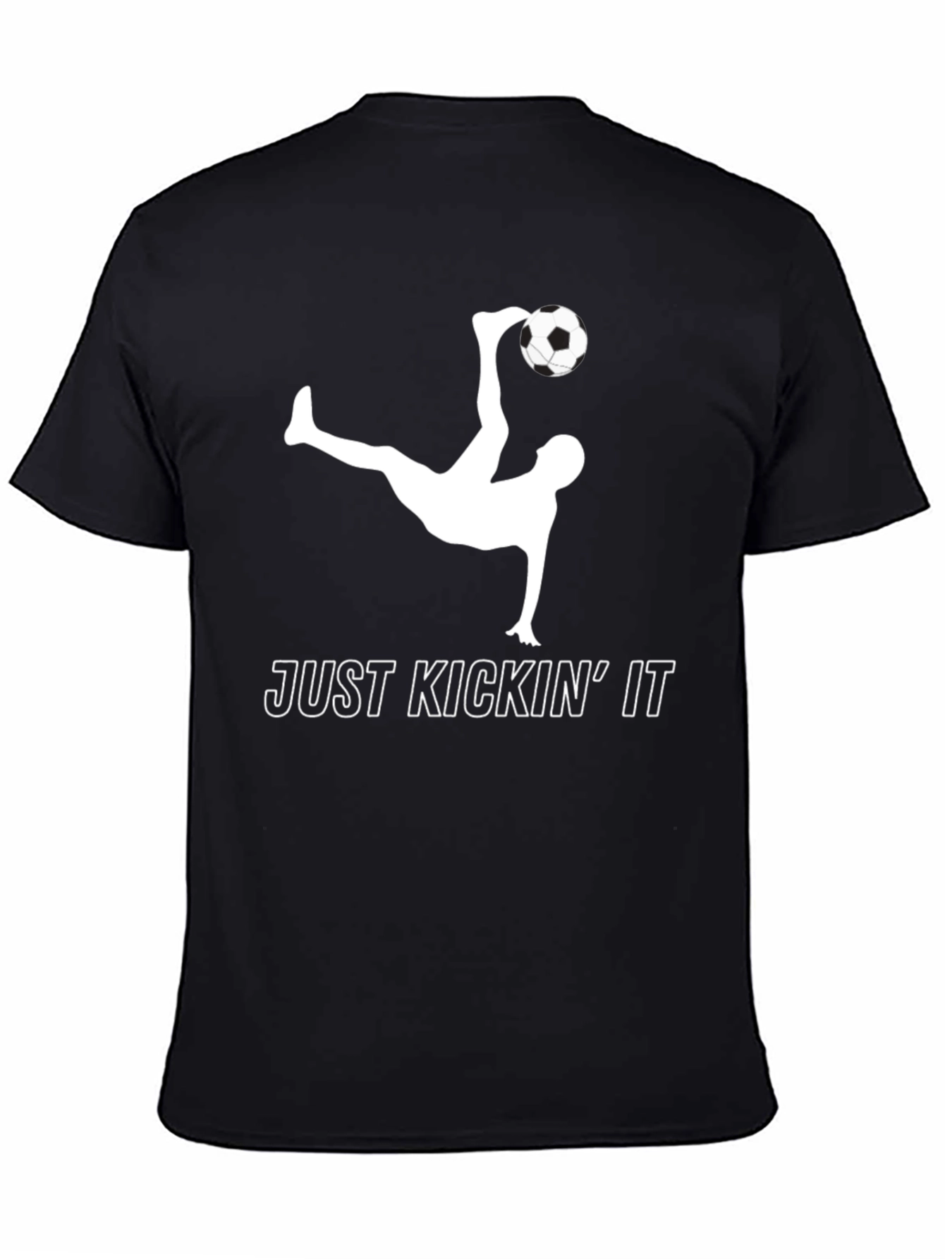 Show off your love for soccer with this stylish black t-shirt. The shirt features a bold white graphic of a soccer player performing a kick, accompanied by the phrase "Just Kickin' It". Made from comfortable materials, this tee is perfect for casual wear, sports practice, or showing support for your favorite team. The eye-catching design and classic fit make it a versatile addition to any wardrobe. Great for soccer fans of all ages! Get yours today and let everyone know you're all about that soccer life.