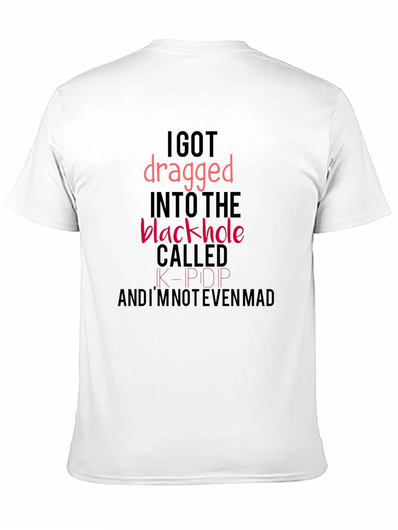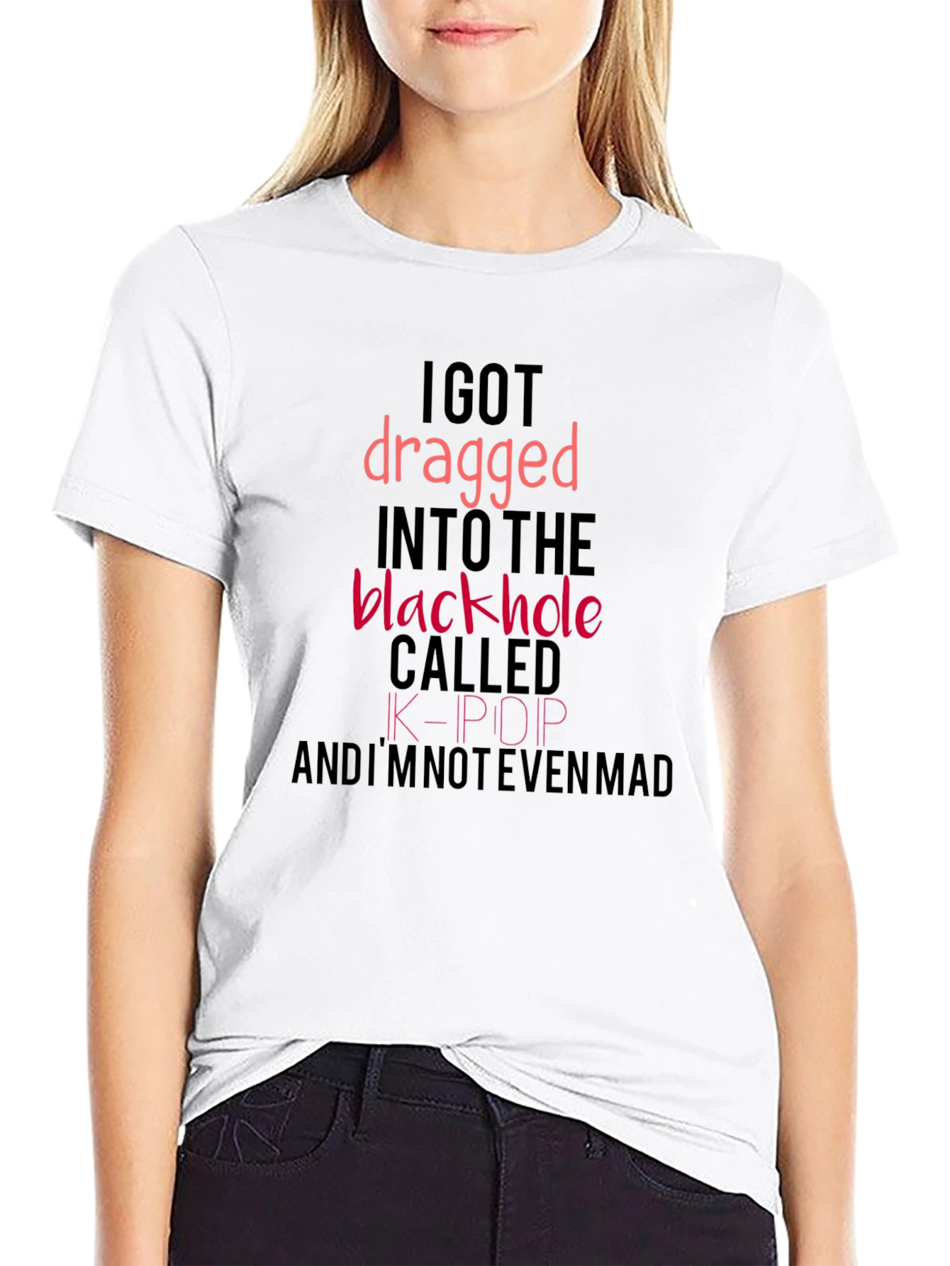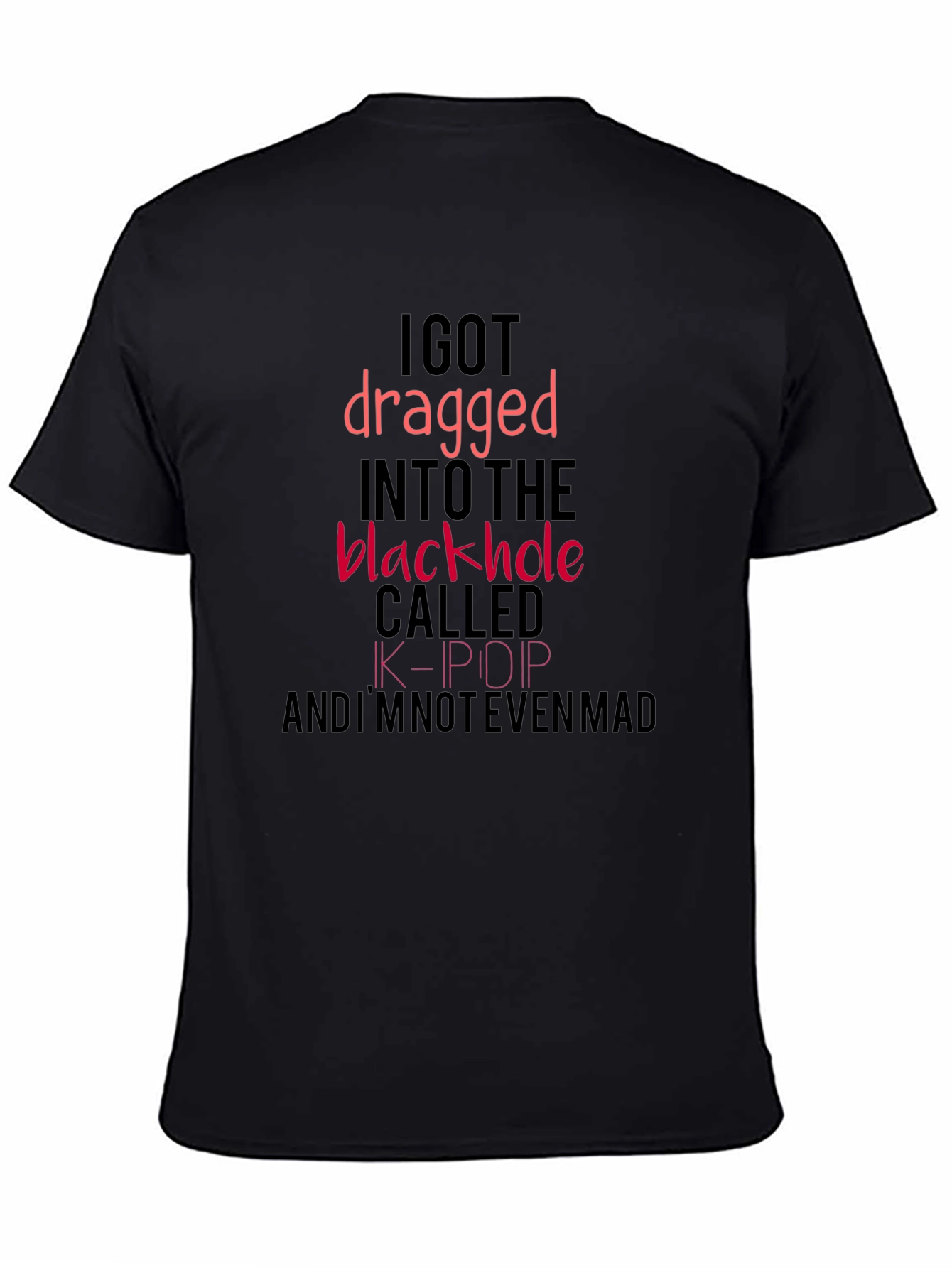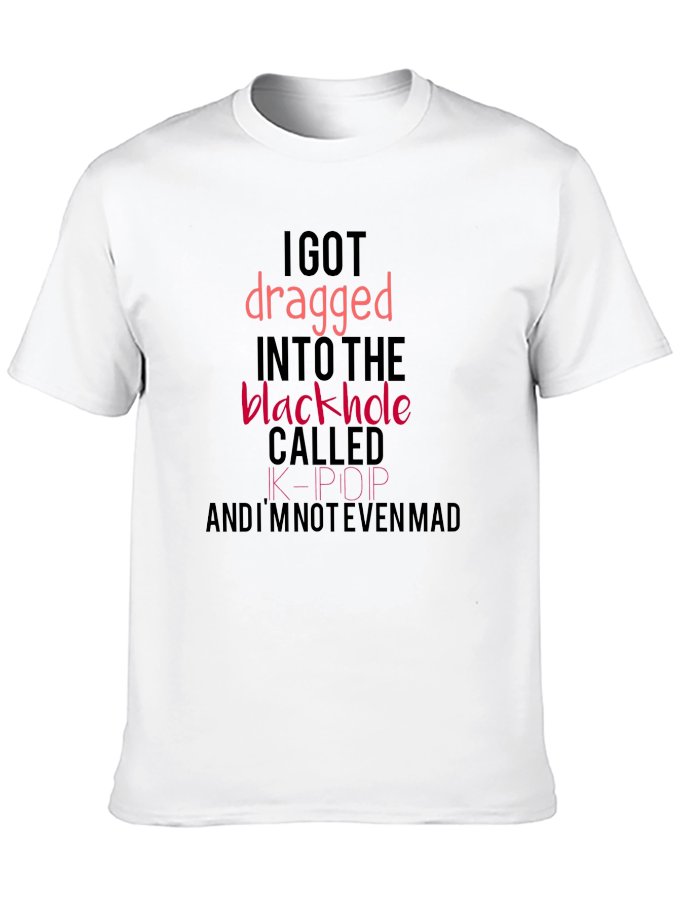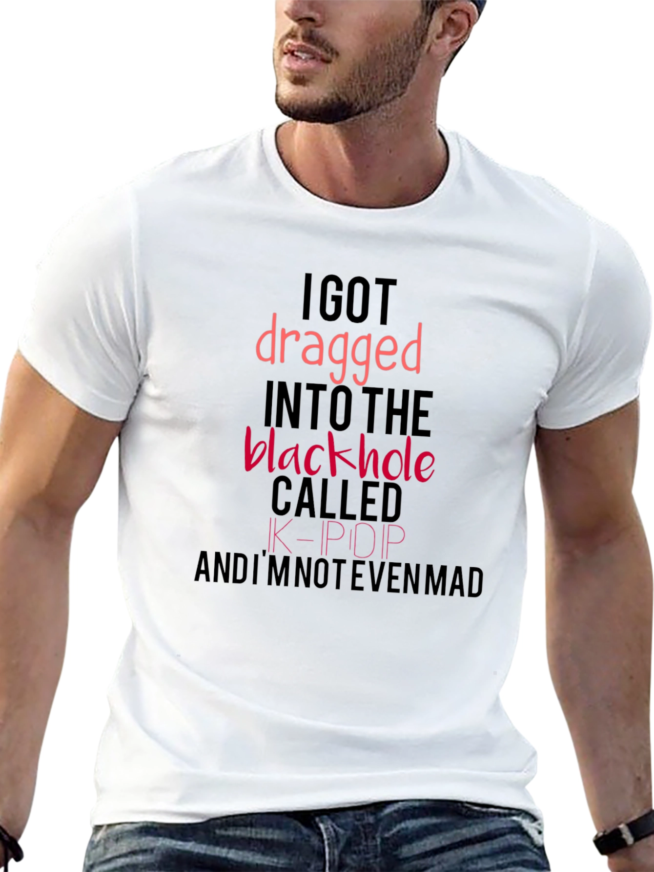 Declare your love for K-Pop with this bold graphic tee. The shirt features the phrase "I got dragged into the black hole called K-Pop and I'm not even mad." The words "dragged" and "black hole" are displayed in a contrasting color, making this a standout piece. Perfect for casual wear or a K-Pop concert, this t-shirt is a must-have for any dedicated fan. Wear it to showcase your K-Pop obsession in comfort and style!
