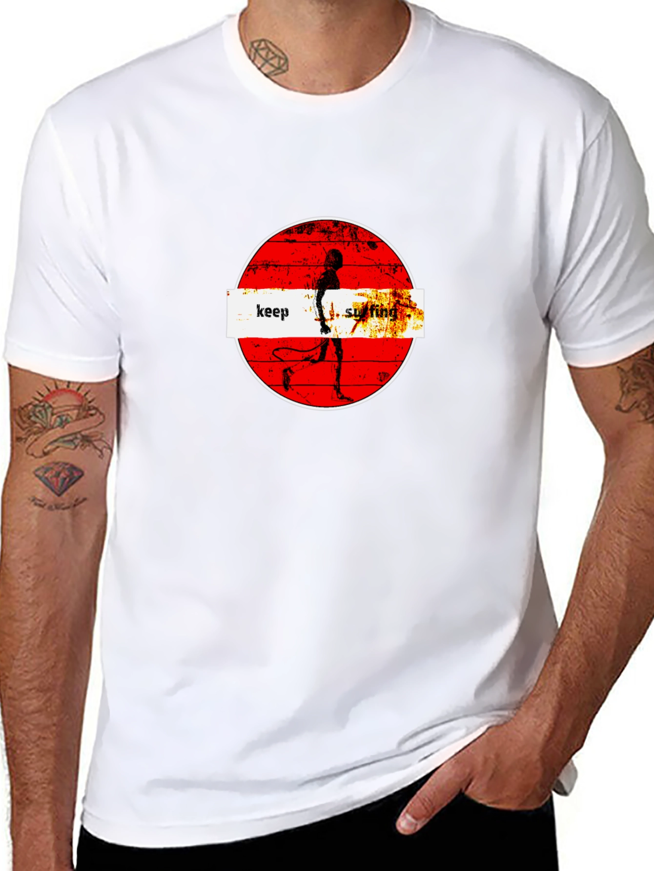 Ride the wave of style with this bold black t-shirt! Featuring a striking circular graphic design with a surfer silhouette and the words "Keep Surfing," this tee is perfect for surf enthusiasts and casual wear alike. The design is printed on soft, breathable fabric, ensuring comfort throughout the day. Its versatile style makes it great for beach days, concerts, or everyday wear. Show off your love for the surf lifestyle with this unique and eye-catching tee. Get yours today and let the good times roll!