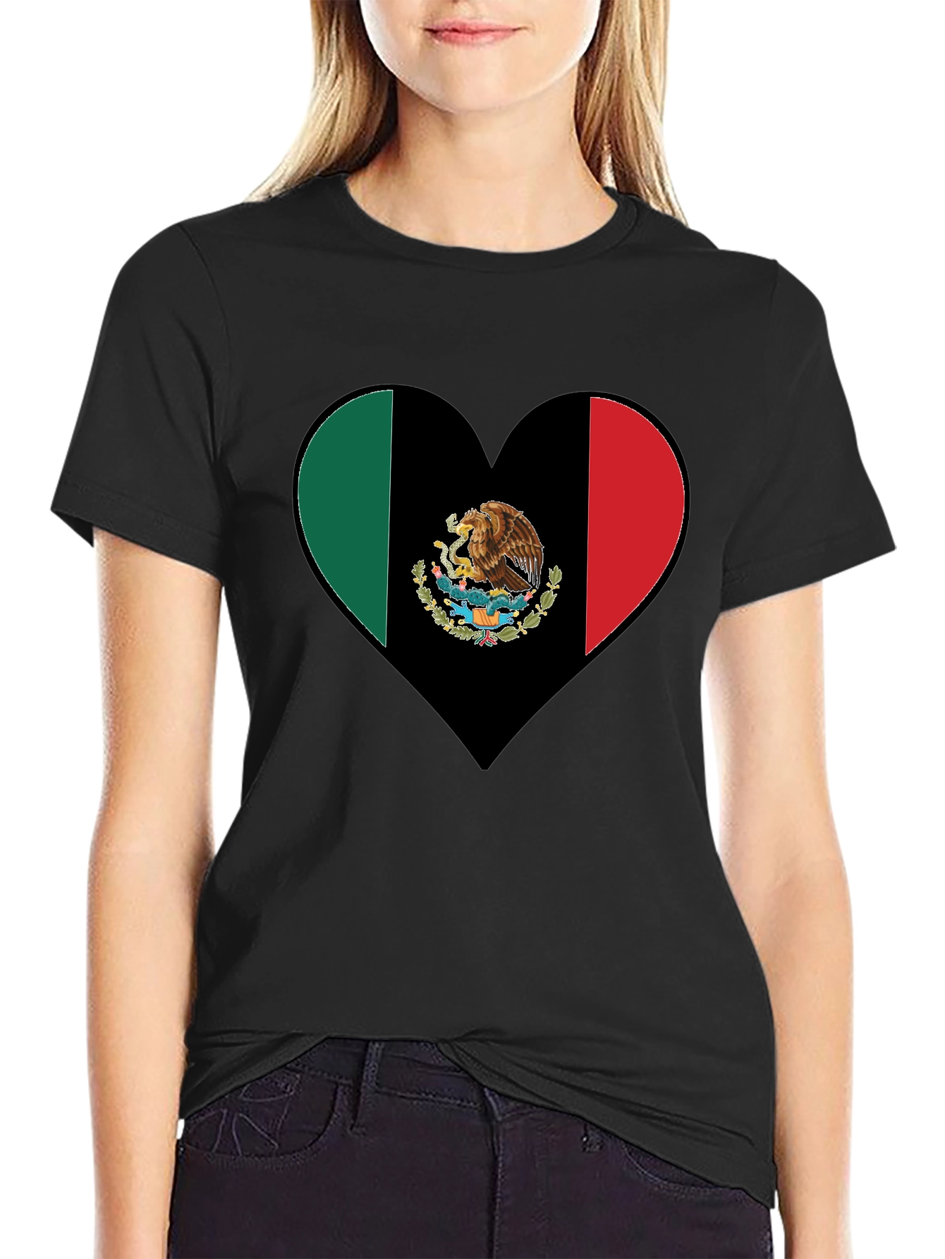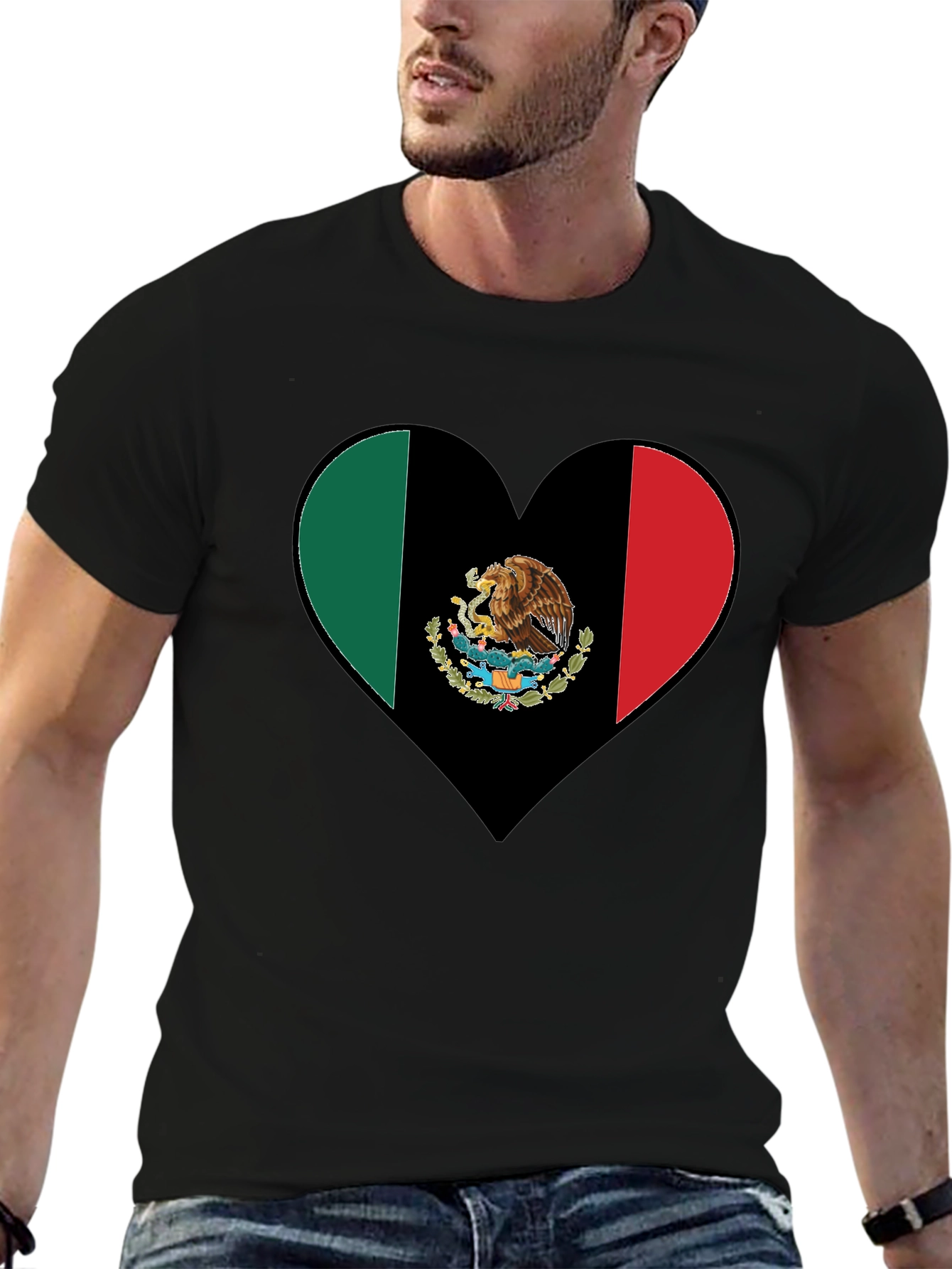 Show your love for Mexico with this stylish black t-shirt. Featuring a vibrant heart design filled with the colors of the Mexican flag and the iconic eagle emblem, this shirt is perfect for celebrating your heritage or showing your support. The design is printed on a comfortable, classic fit tee. Wear it to cultural events, casual outings, or simply to express your Mexican pride. Durable and eye-catching, this t-shirt is sure to turn heads and spark conversations. It's a great way to add a touch of Mexican flair to your wardrobe.