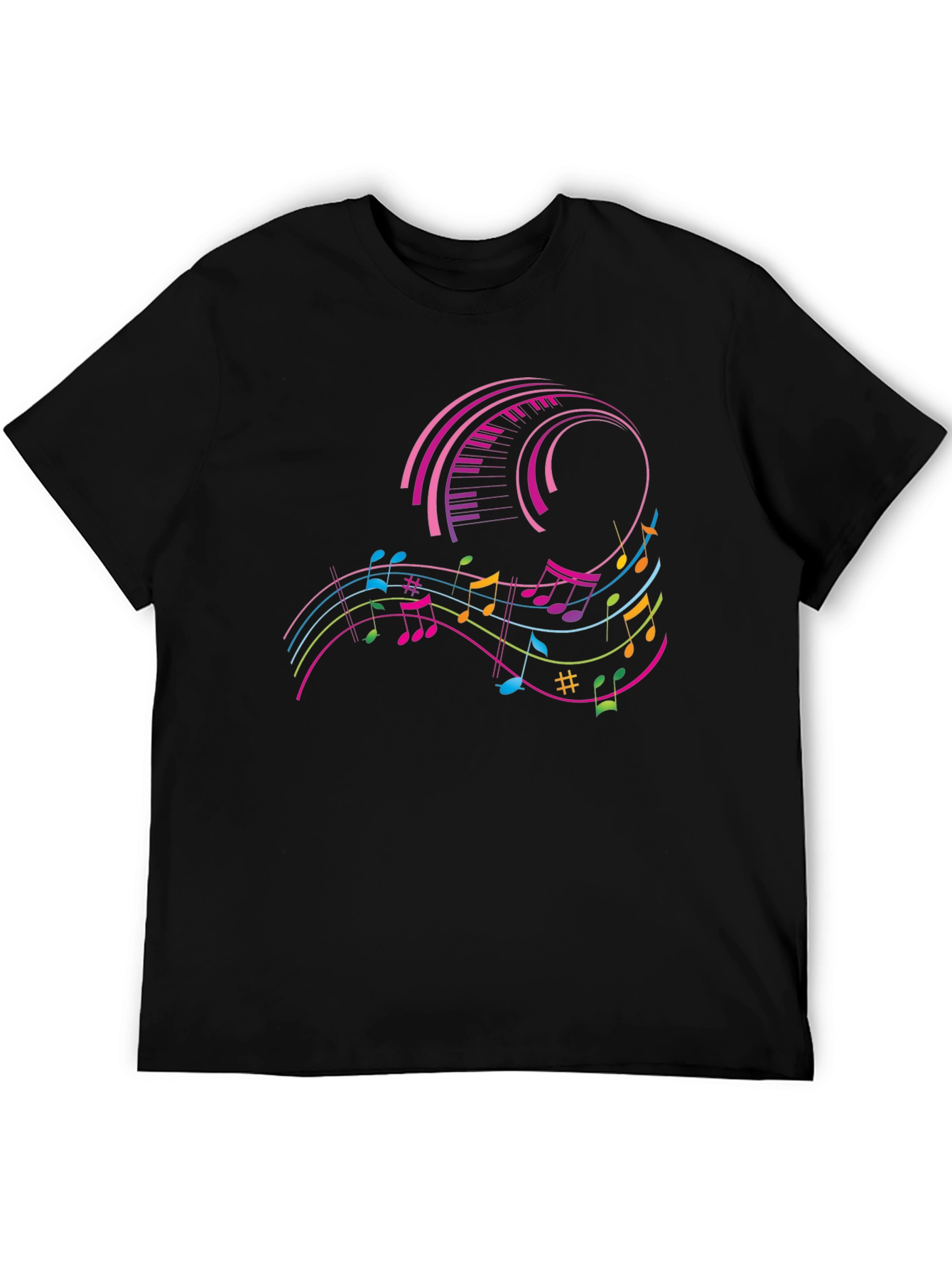 Show off your love for music with this stylish black graphic tee. This t-shirt features a vibrant and eye-catching design of musical notes and a keyboard graphic in bright, swirling colors. The design is printed on a comfortable, classic fit black t-shirt. Perfect for musicians, music lovers, or anyone who appreciates unique and artistic apparel. Wear it casually with jeans or dress it up with a blazer for a trendy look. A great conversation starter and a must-have addition to any music enthusiast's wardrobe.