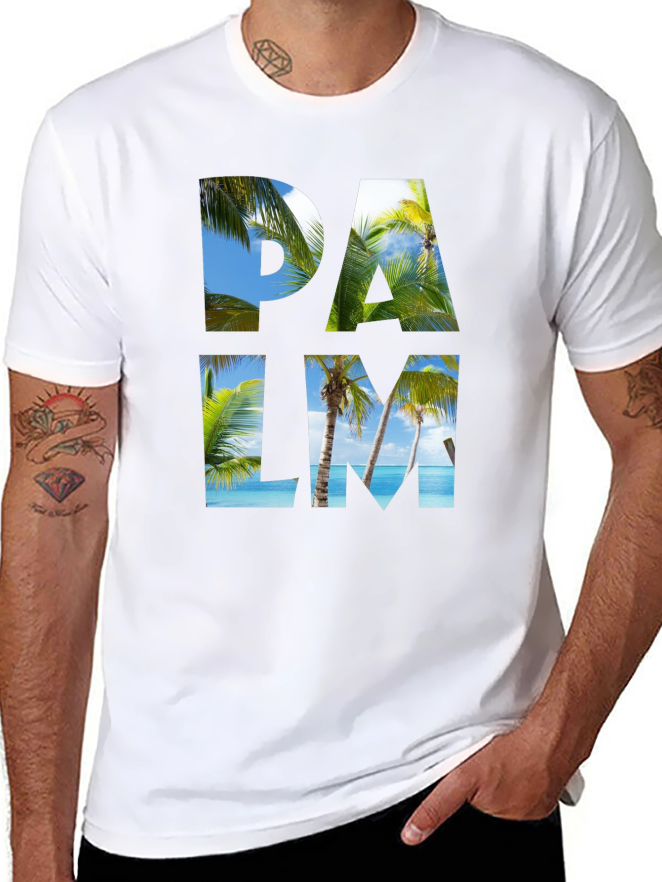 Embrace the island life with this stylish black t-shirt. Featuring a unique "PALM" graphic filled with vibrant palm tree imagery, it brings a touch of tropical paradise to your wardrobe. The design incorporates lush greenery, blue skies, and serene ocean views within the letters. Made from a soft, breathable fabric, this tee offers all-day comfort and a relaxed fit. Perfect for casual outings, beach trips, or simply lounging in style, this t-shirt is sure to turn heads and evoke a vacation vibe wherever you go. Get yours today and wear the tropics!
