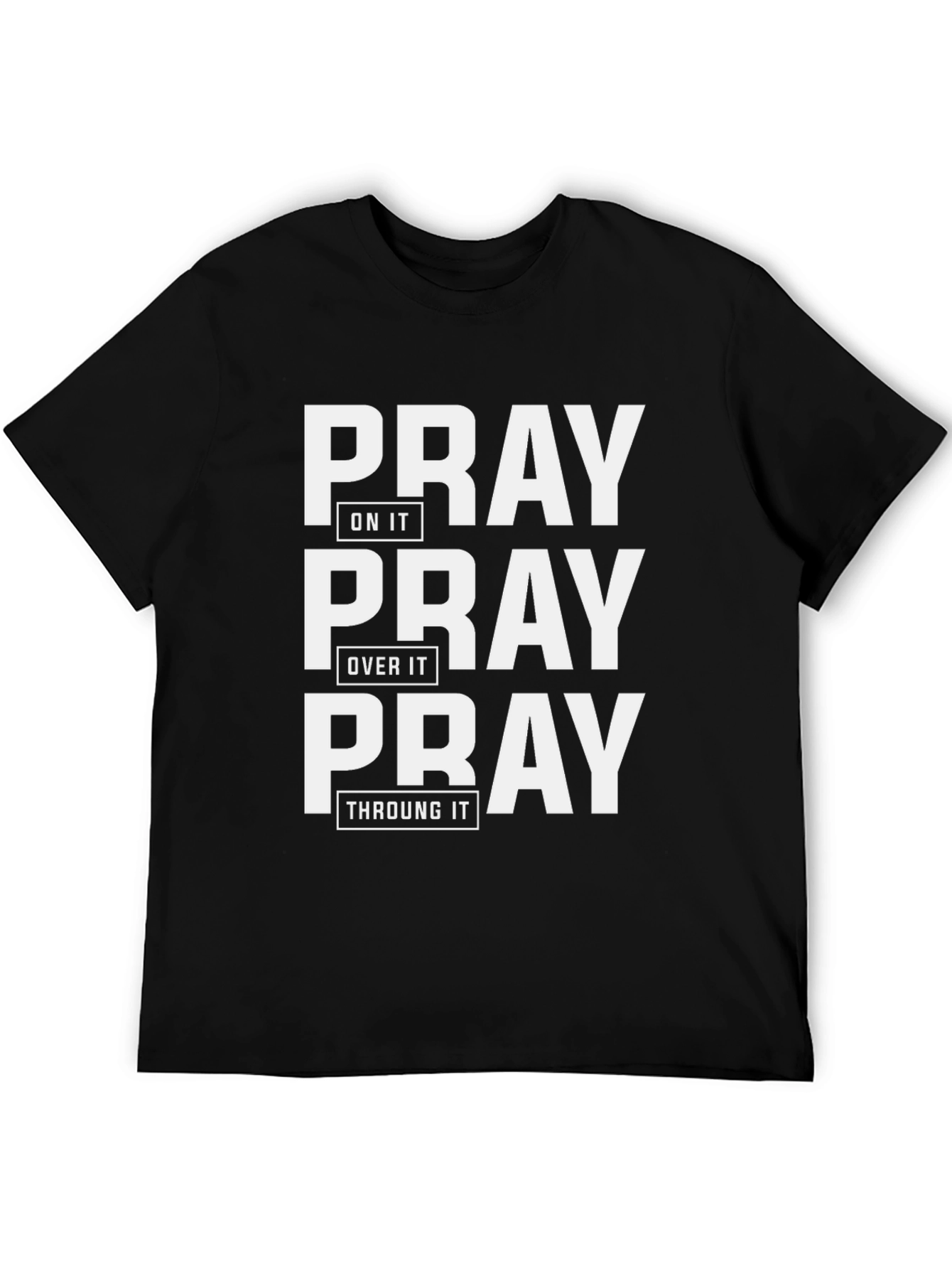 This striking black t-shirt features a bold, white graphic print that reads "PRAY ON IT, PRAY OVER IT, PRAY THROUGH IT." The design is clean and modern, making it a versatile addition to any wardrobe. Crafted from a comfortable-looking fabric, this tee is perfect for everyday wear. The short-sleeved design and classic fit ensure a relaxed and stylish look. Ideal for expressing your faith and inspiring others, this t-shirt is a great conversation starter. Whether you're heading to church, running errands, or simply lounging at home, this 'Pray On It' tee is a perfect choice to wear and share your beliefs.