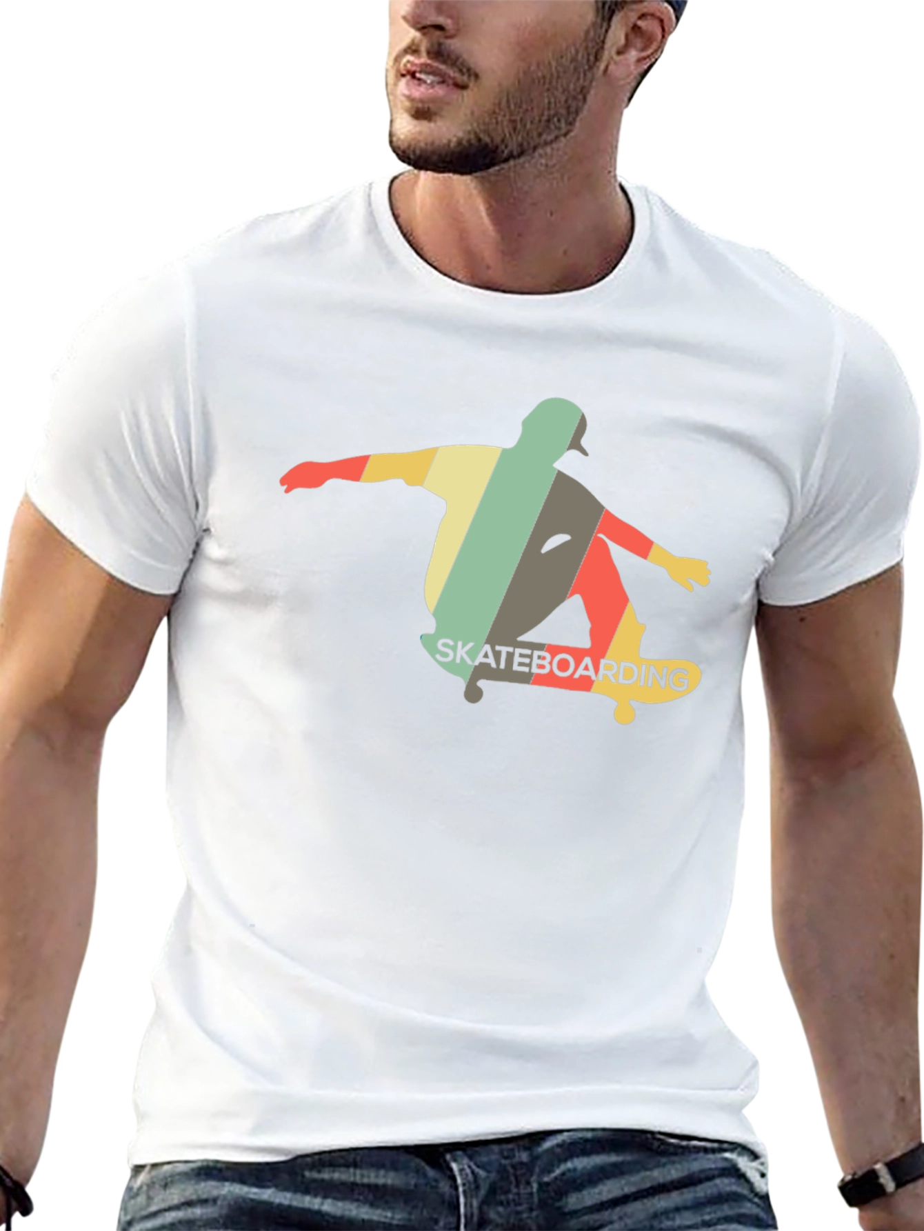 Show off your love for skateboarding with this stylish black cotton t-shirt. The shirt features a retro-inspired graphic of a skateboarder in action, with a cool vintage color palette. The word "SKATEBOARDING" is printed below the skater. Made from soft, breathable cotton, this tee is perfect for everyday wear. It's a great way to express your personality and passion for skateboarding. The classic fit and durable construction make it a wardrobe staple. Wear it while hitting the skate park, hanging out with friends, or just cruising around town. This t-shirt is sure to turn heads and start conversations.