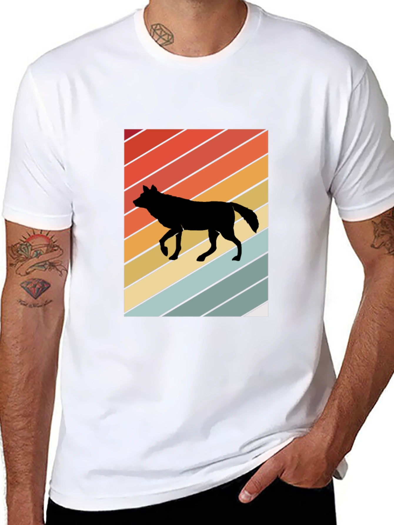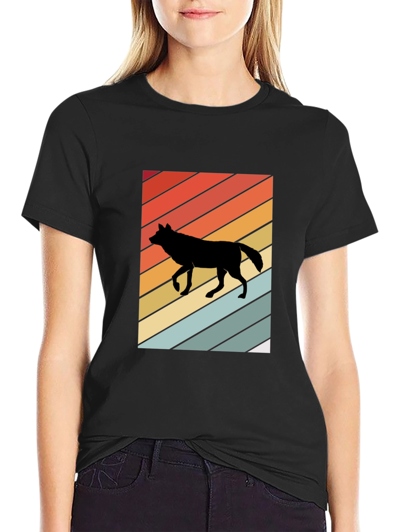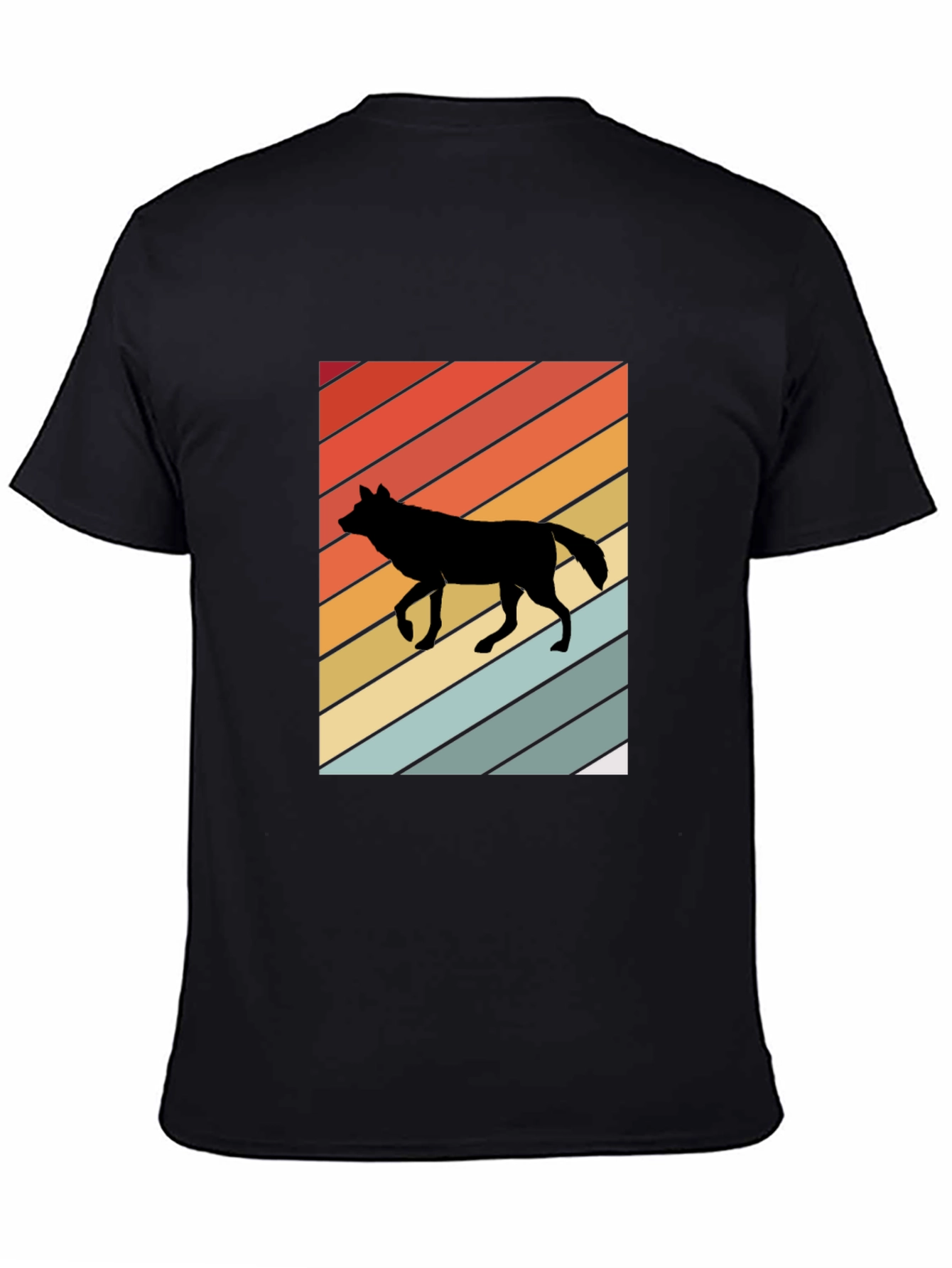 This stylish black t-shirt features a striking retro-themed graphic. A black wolf silhouette stands out against a background of horizontal stripes in warm orange, red, yellow, and cool blue tones. The design has a vintage aesthetic. The shirt itself appears to be made from a comfortable, breathable fabric, perfect for everyday wear. Show off your love for wildlife and retro style with this unique tee! Ideal for casual outings, concerts, or just lounging around. Make a statement with this eye-catching design!