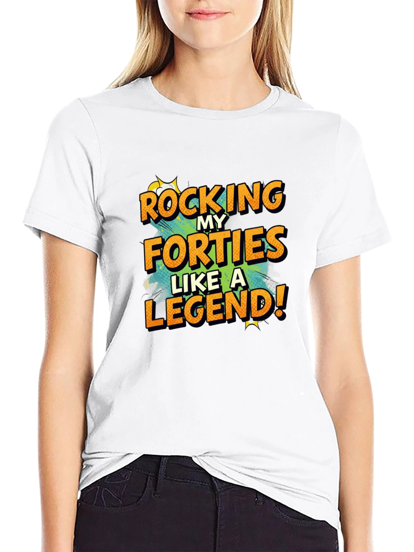 Celebrate the big 4-0 in style with this "Rocking My Forties Like a Legend!" graphic t-shirt. This eye-catching design features bold, comic-book-style lettering in vibrant orange and yellow. The background has the look of a green and blue explosion. Made from comfortable, breathable cotton or cotton blend fabric, this short-sleeve tee is perfect for casual wear, birthday parties, or as a fun gift for that special 40-year-old in your life. Show off your legendary status and embrace your forties with confidence. Get ready to rock this milestone year!