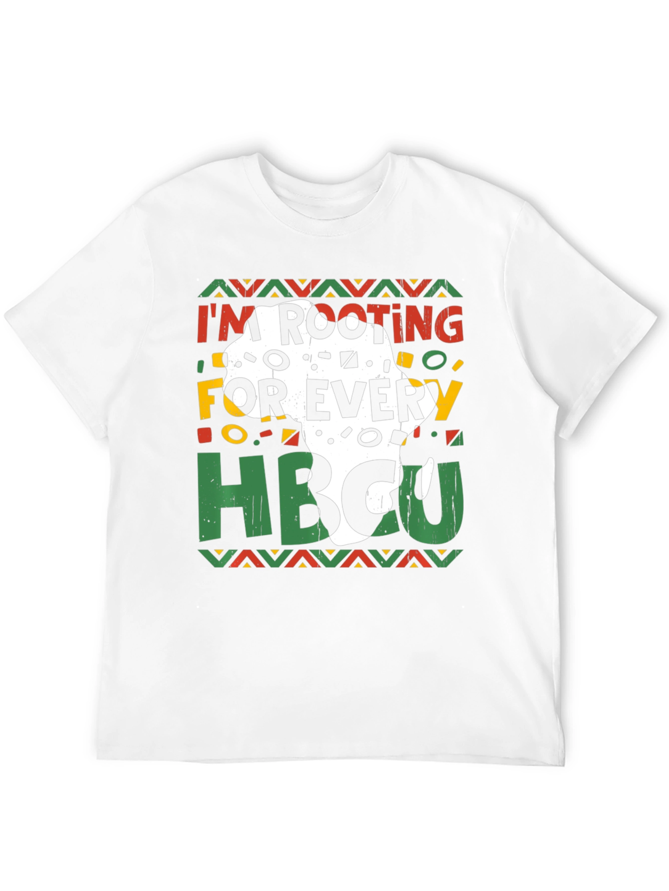 Show your support for Historically Black Colleges and Universities with this stylish and eye-catching black graphic tee. The design features the phrase "I'M ROOTING FOR EVERY HBCU" in bold, vibrant colors reminiscent of African heritage. Geometric patterns accent the top and bottom, adding a touch of cultural flair. The graphic uses a black silhouette of the continent of Africa as part of the design. Made from a comfortable-looking material, this tee is perfect for everyday wear, campus events, or showing your pride at HBCU games. This t-shirt is sure to turn heads and spark conversations wherever you go. Wear your support proudly and make a statement with this unique HBCU tee!