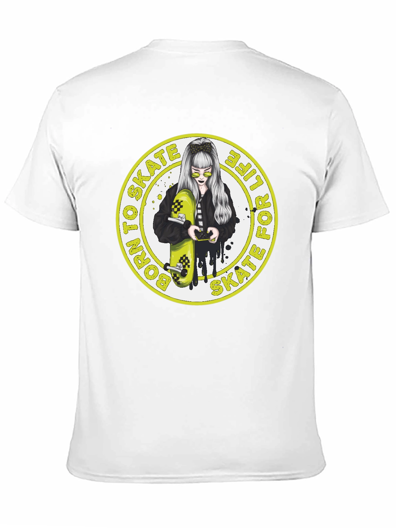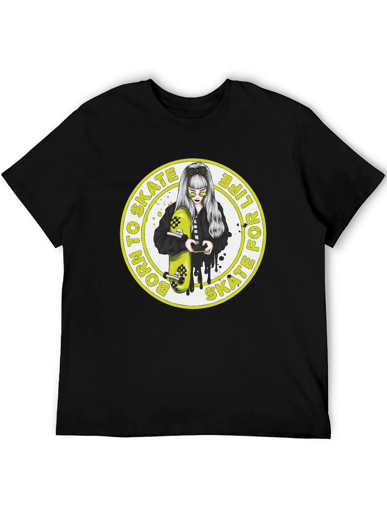Rock your skater style with this unique black t-shirt! Featuring a bold graphic of a stylish girl holding a skateboard, this tee is perfect for anyone who loves skateboarding or wants to add an edgy touch to their wardrobe. The graphic is encased in a yellow circular border with the words 'Born to Skate, Skate for Life'. Made from a comfortable and durable fabric, this shirt is ideal for everyday wear. Show off your passion for skateboarding and stand out from the crowd with this must-have tee. A great gift for skaters!