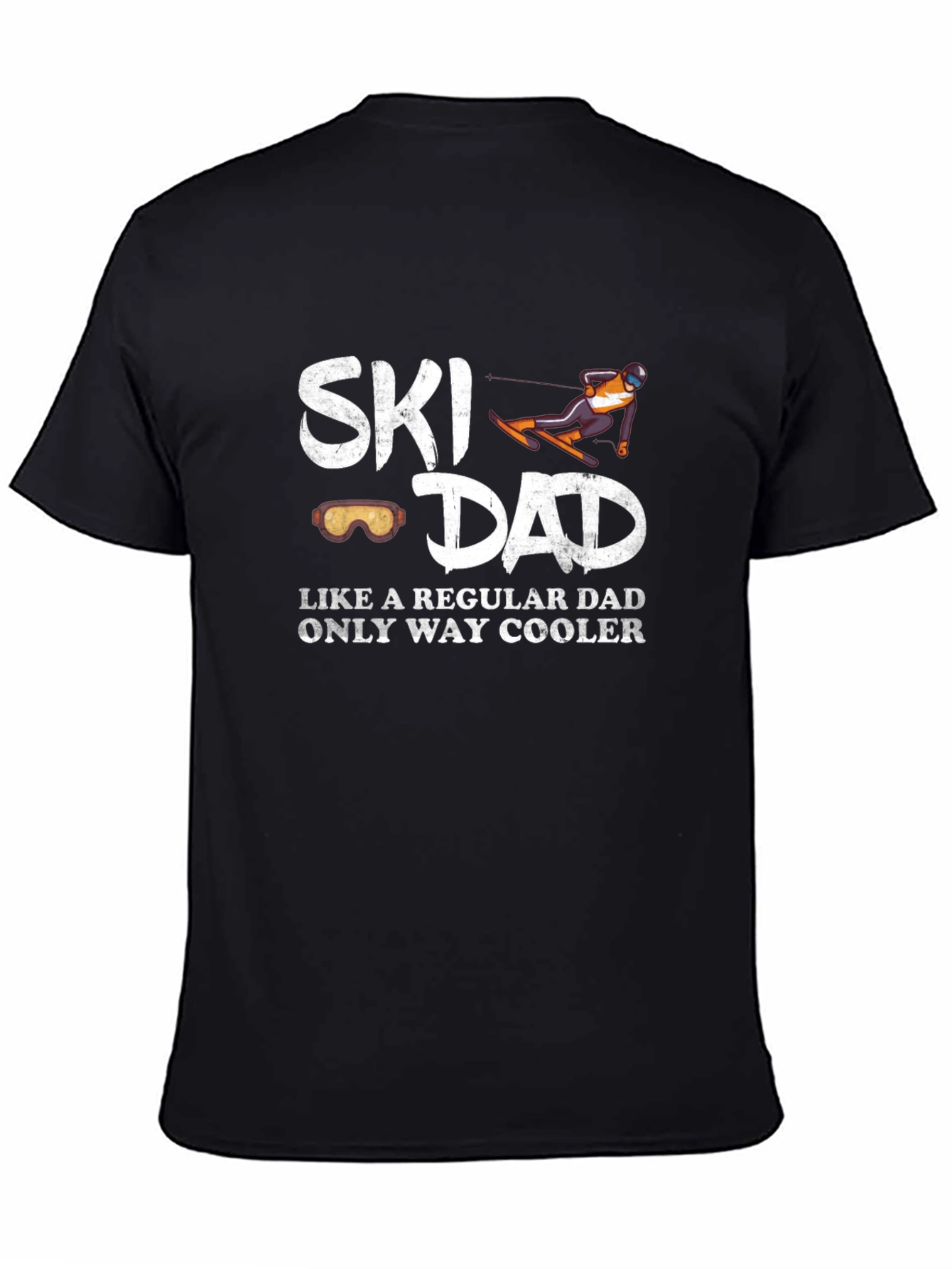 Show off your love for skiing with this "Ski Dad" graphic t-shirt! This stylish black tee features a playful design, including ski goggles and a skier, combined with the phrase "Like a regular dad only way cooler". Made from a comfortable material that appears to be soft and breathable, this tee is perfect for casual wear, a day on the slopes, or as a fun gift for the skiing enthusiast dad in your life. Its classic fit makes it a versatile addition to any wardrobe, easily paired with jeans, shorts, or layered under a jacket. Get yours today and let everyone know you're a cool skiing dad!