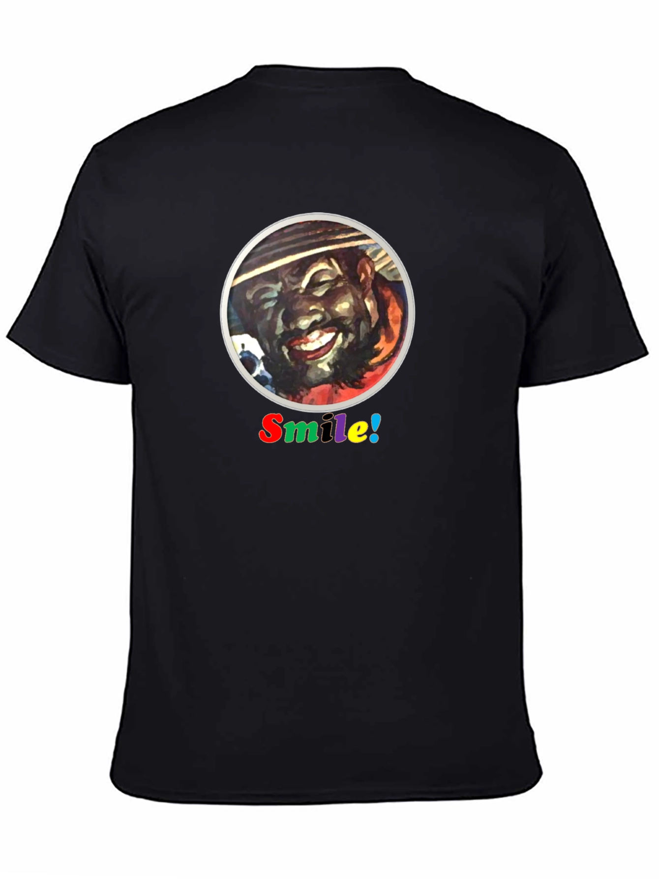 Show off your positive attitude with this eye-catching black T-shirt. The shirt features a vibrant, circular graphic of a smiling face, framed by a crisp white border. Below the image, the word "Smile!" is playfully displayed in a rainbow of colors, adding a touch of whimsy. Made from a comfortable, breathable fabric, this tee is perfect for casual wear. This T-shirt is ideal for expressing your cheerful personality and spreading good vibes wherever you go. Wear it to social gatherings, on relaxed outings, or simply as a fun addition to your everyday wardrobe. It's a great conversation starter and a unique piece that is sure to bring smiles to those around you.
