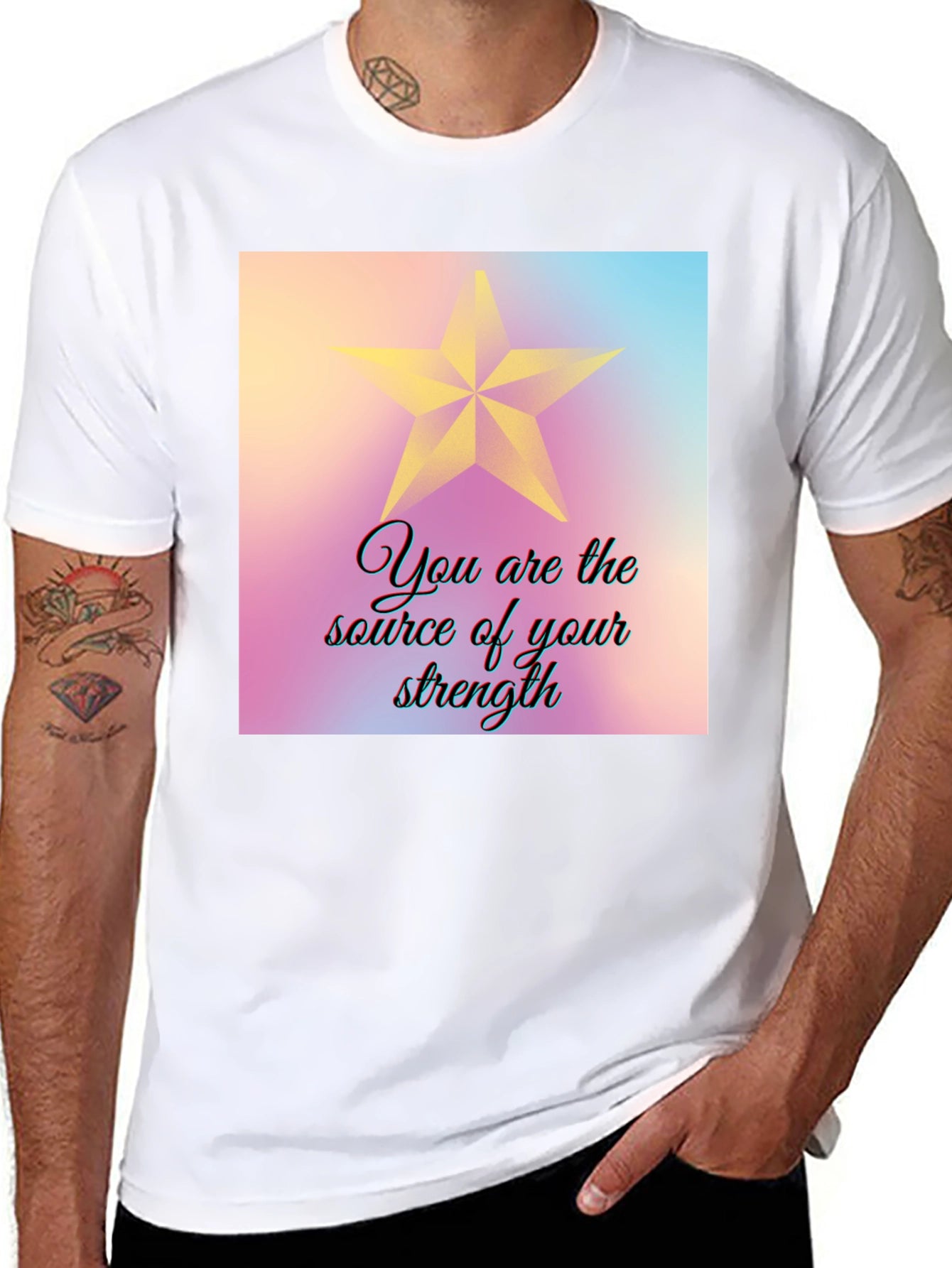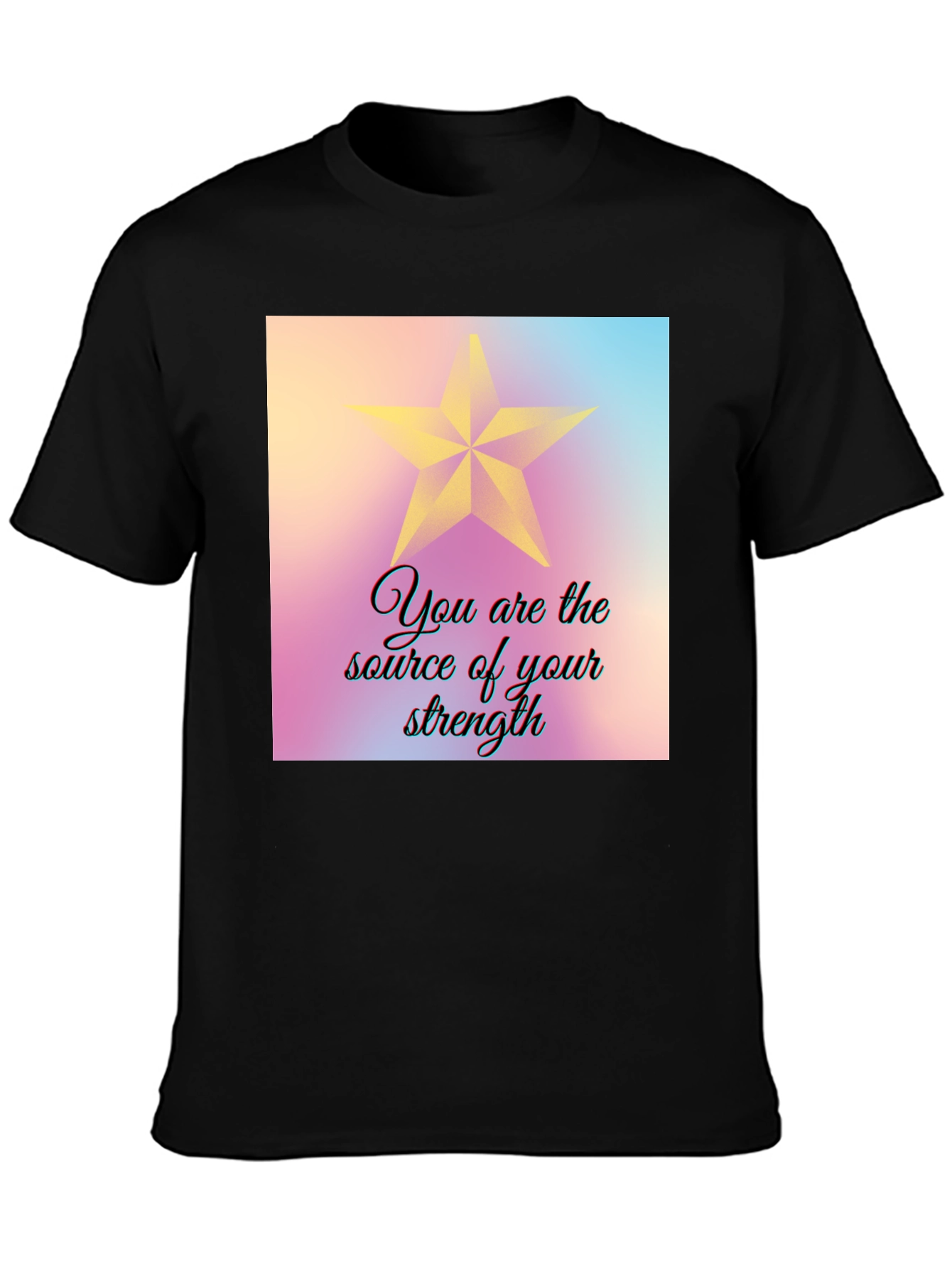 Embrace your inner strength with this stylish black t-shirt featuring a vibrant graphic print. The design showcases a gradient background with a radiant star and the empowering message: "You are the source of your strength". Made from a comfortable, breathable fabric, this tee is perfect for everyday wear. Its motivational message makes it an excellent choice for workouts, casual outings, or simply expressing your positive mindset. Show the world your confidence and inspire others with this unique and uplifting t-shirt. Order yours today and radiate positivity!