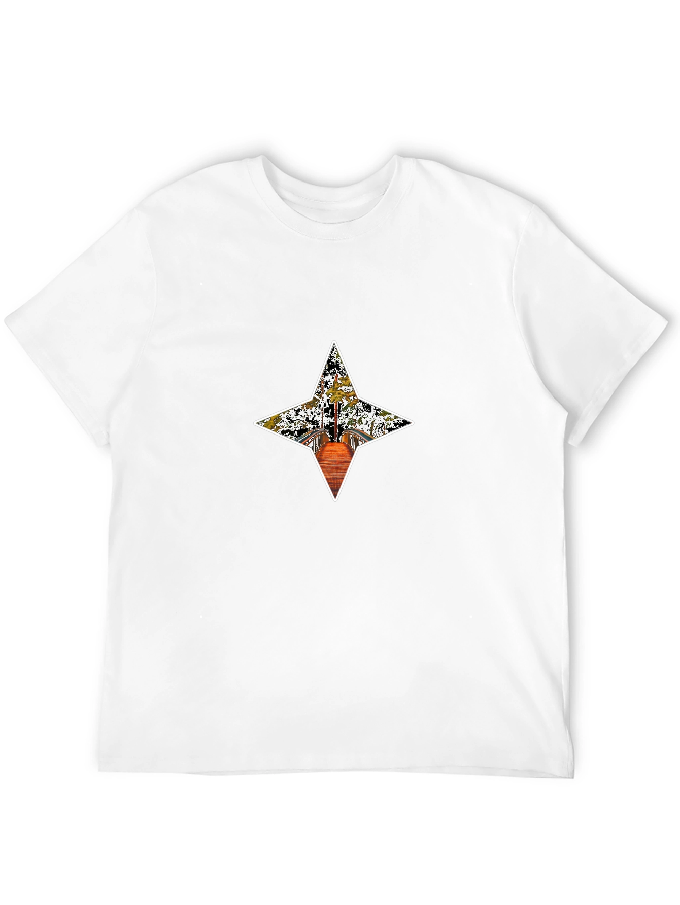 Elevate your casual style with this eye-catching black t-shirt. Crafted from a soft, comfortable fabric, this tee features a unique star-shaped graphic on the front. Inside the star reveals a captivating bridge scene amidst a natural backdrop. The design adds a touch of artistry and individuality to your everyday wardrobe. Perfect for casual outings, concerts, or simply lounging at home, this t-shirt is a versatile addition to any wardrobe. The classic black color ensures it pairs effortlessly with jeans, shorts, or chinos. Express your unique sense of style with this standout tee.