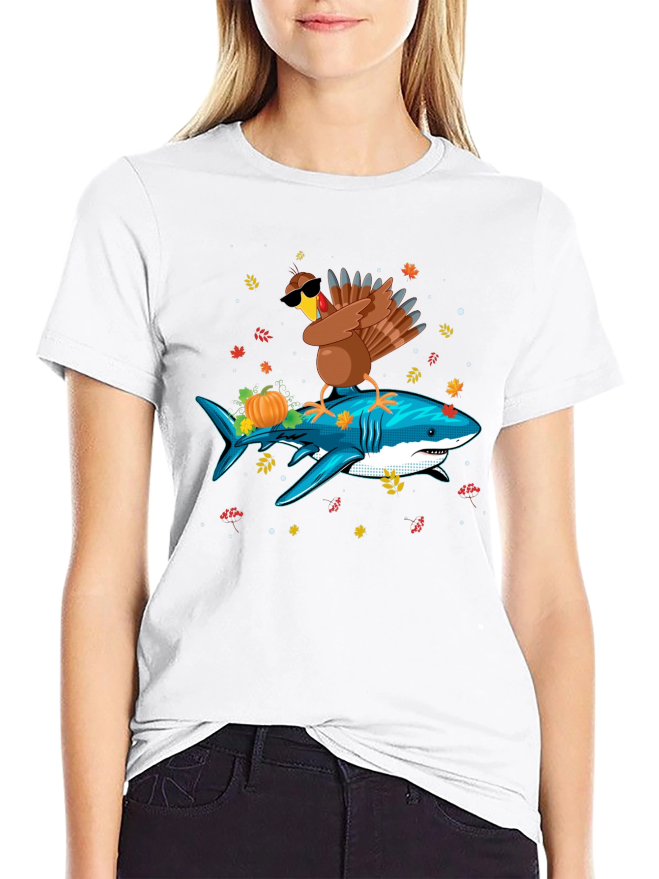 Get ready to make a splash this Thanksgiving with our unique t-shirt! This eye-catching black tee features a hilarious graphic of a cool turkey wearing sunglasses, riding a blue shark adorned with a festive pumpkin. The design is set against a backdrop of autumn leaves, creating a fun, seasonal vibe. Made from soft, comfortable fabric, this shirt is perfect for Thanksgiving dinner, casual outings, or holiday parties. Show off your sense of humor and stand out from the crowd with this conversation-starting tee. Makes a great gift for the fun-loving folks in your life!