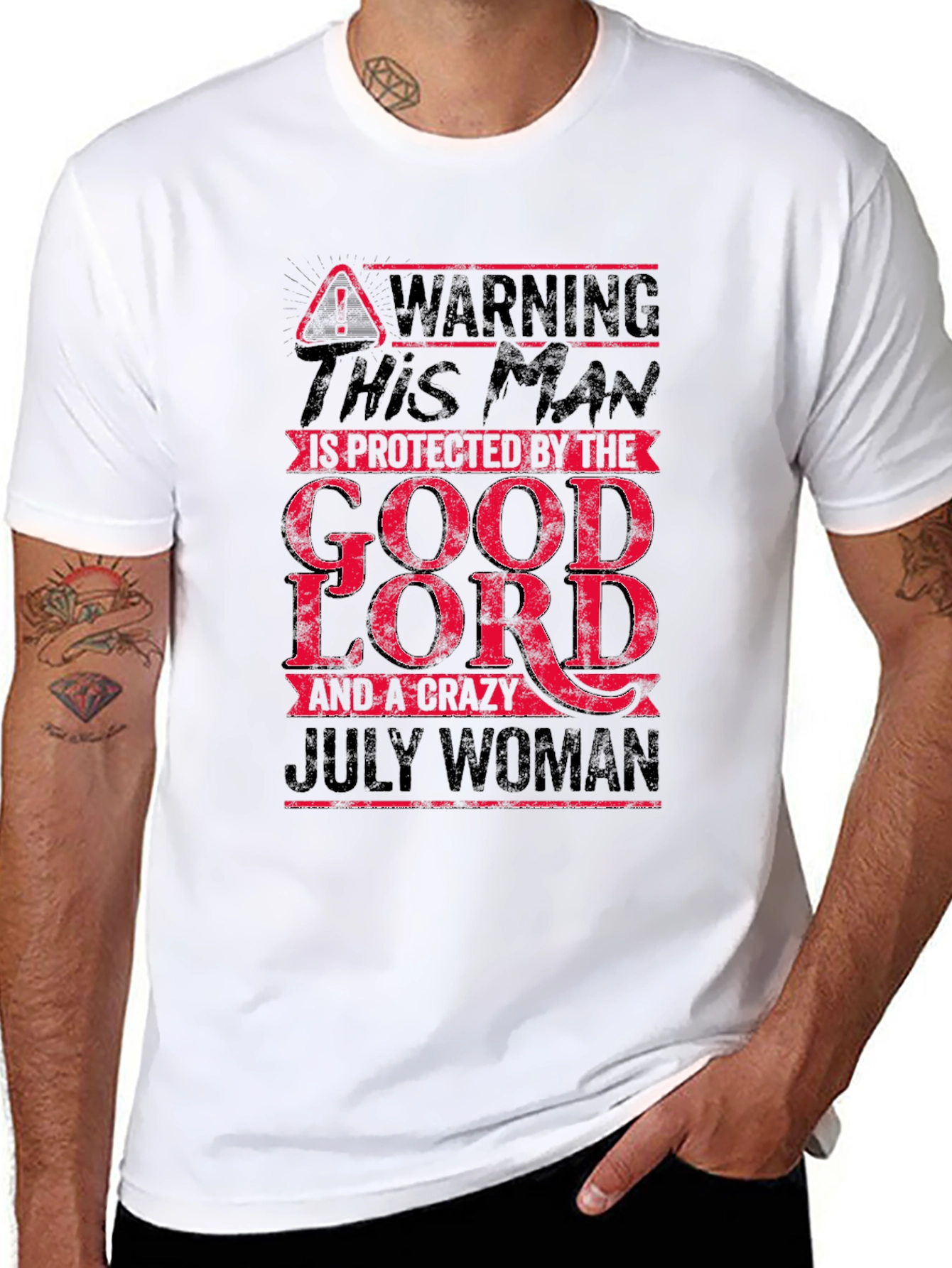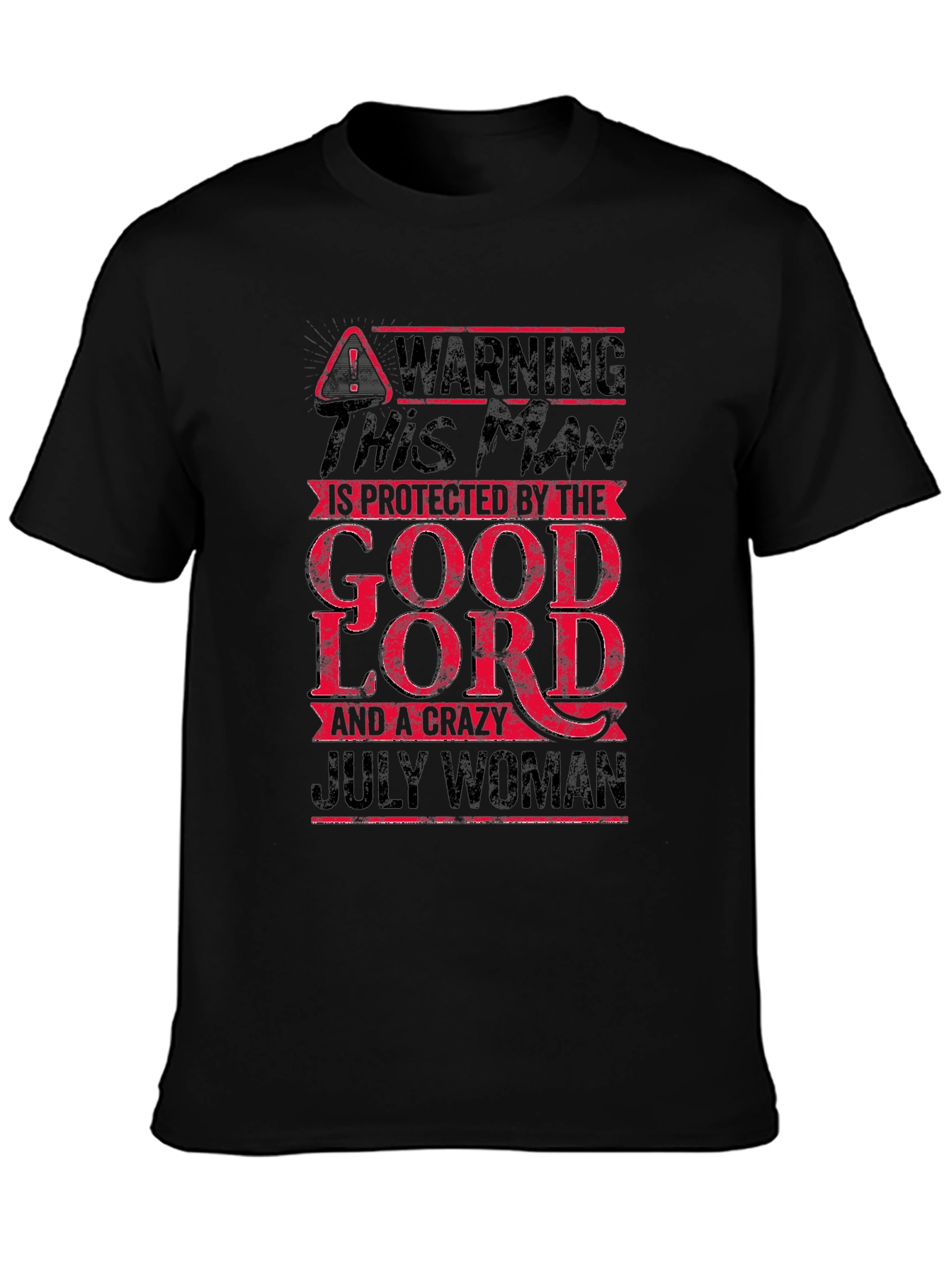 This black t-shirt features a bold and humorous statement. The design includes the text "Warning This Man is Protected by the Good Lord and a Crazy July Woman." The lettering is a textured red, giving it a slightly distressed and eye-catching look. The shirt is made of a soft-looking fabric. Perfect for casual wear, this t-shirt is sure to spark conversations and bring a smile to anyone who sees it. Makes a great gift for the man who has everything!
